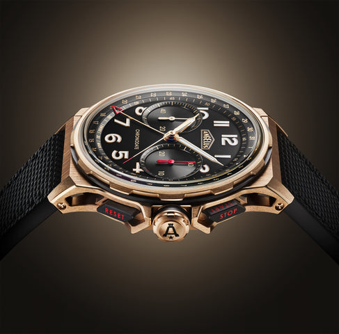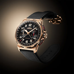 Angelus Watch Chronodate Red Gold Rubber 0CDZE.B01A.K009B. Around this container, Angelus has designed an attachment system consisting of an openworked cradle that brings the case middle and lugs into a single line, made from 5N red gold or titanium. It also houses the bezel marked with 12 notches, which is also cut from these same metals.