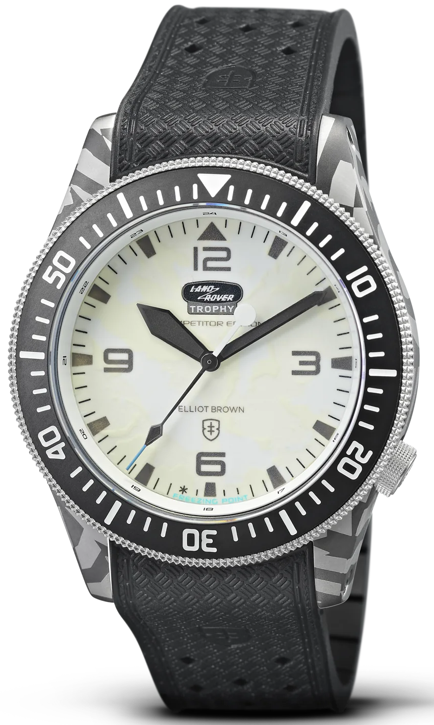 Elliot Brown Watch Holton Land Rover x Elliot Brown Snow Limited Edition. This Limited Edition watch is a collaboration with Land Rover Classic, celebrating the exclusive production of 25 Classic Defender Works V8 Trophy II competition vehicles.