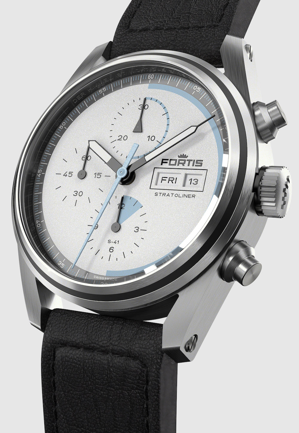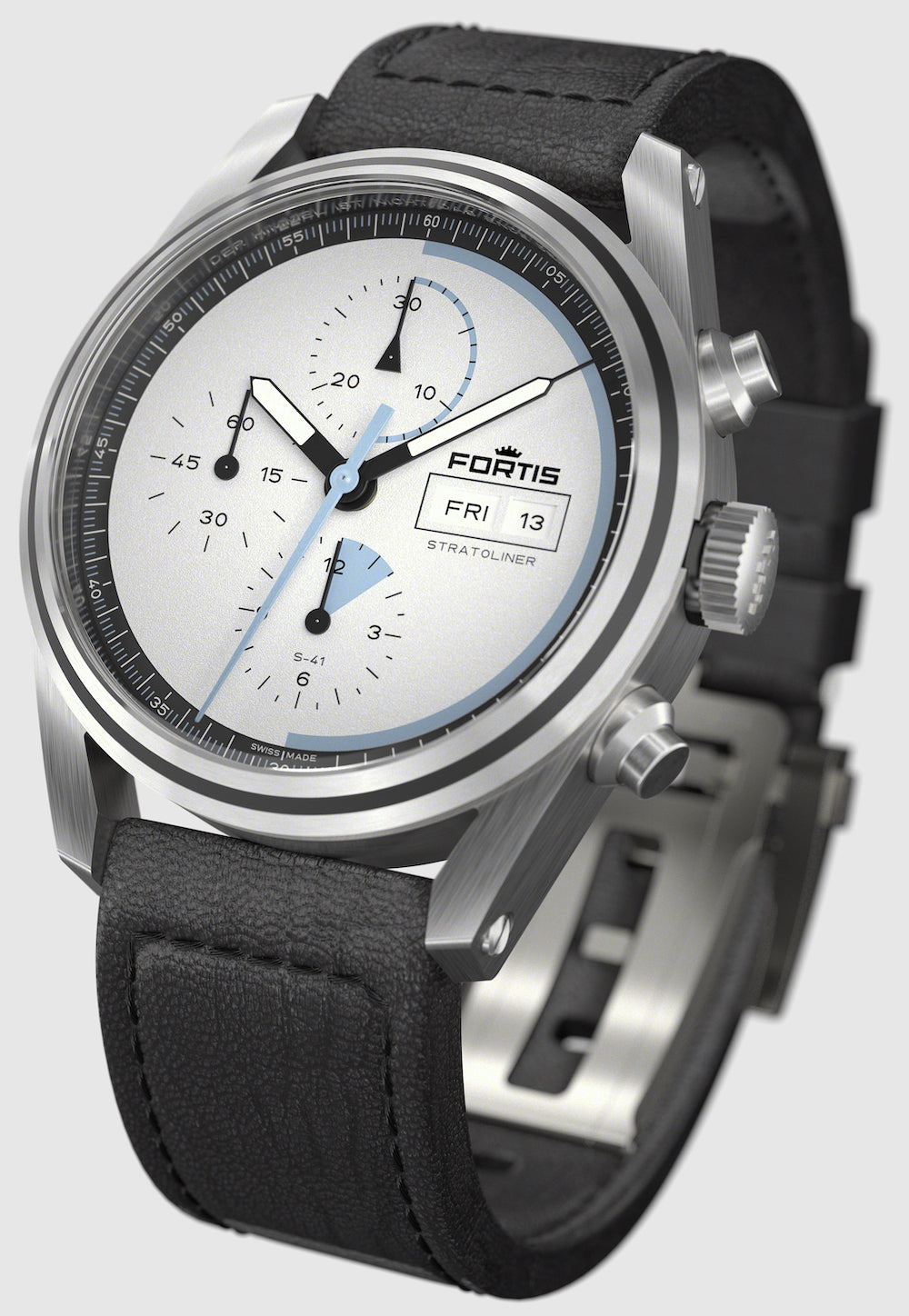 Fortis Watch Stratoliner White Dust Aviator Strap F2340014. Adding to many firsts in the history of Fortis, the redefined Stratoliner Collection features the first manufacture calibre which was custom built for space and tested in the Stratosphere. Inspired by the persistence of great visionaries, the Stratoliner is both tribute and motivation, it is the tool for those inventing tomorrow. It is the tool to go beyond the impossible.