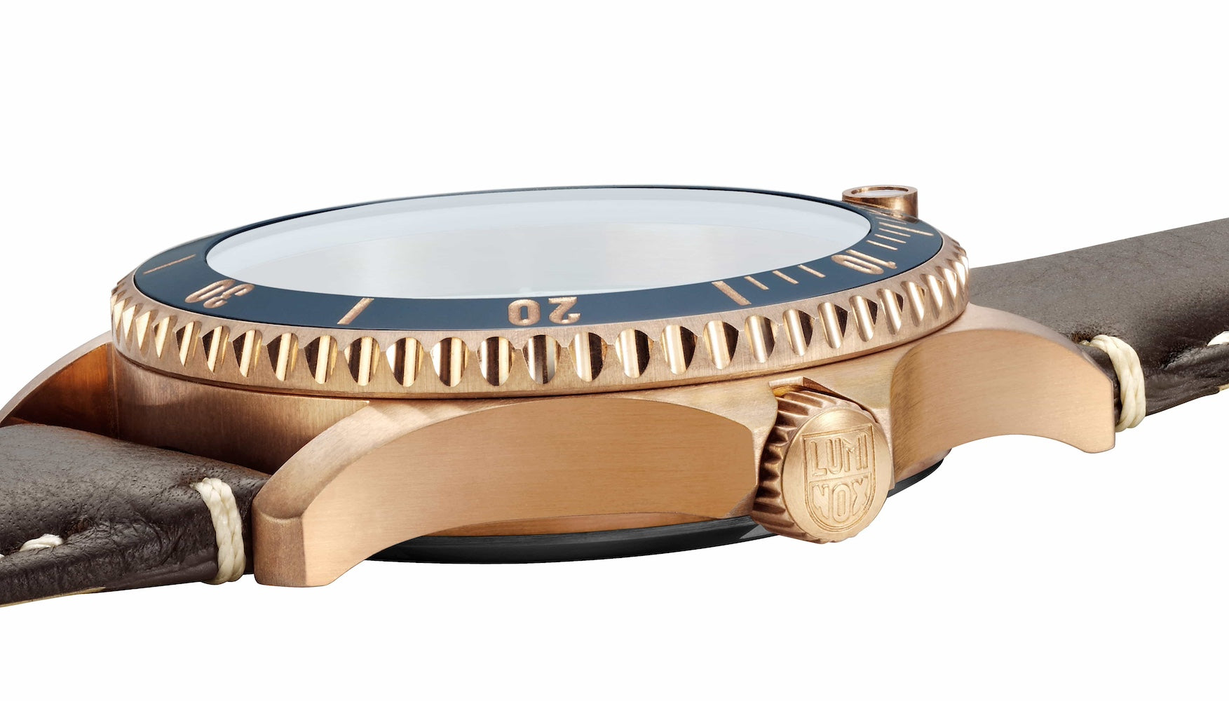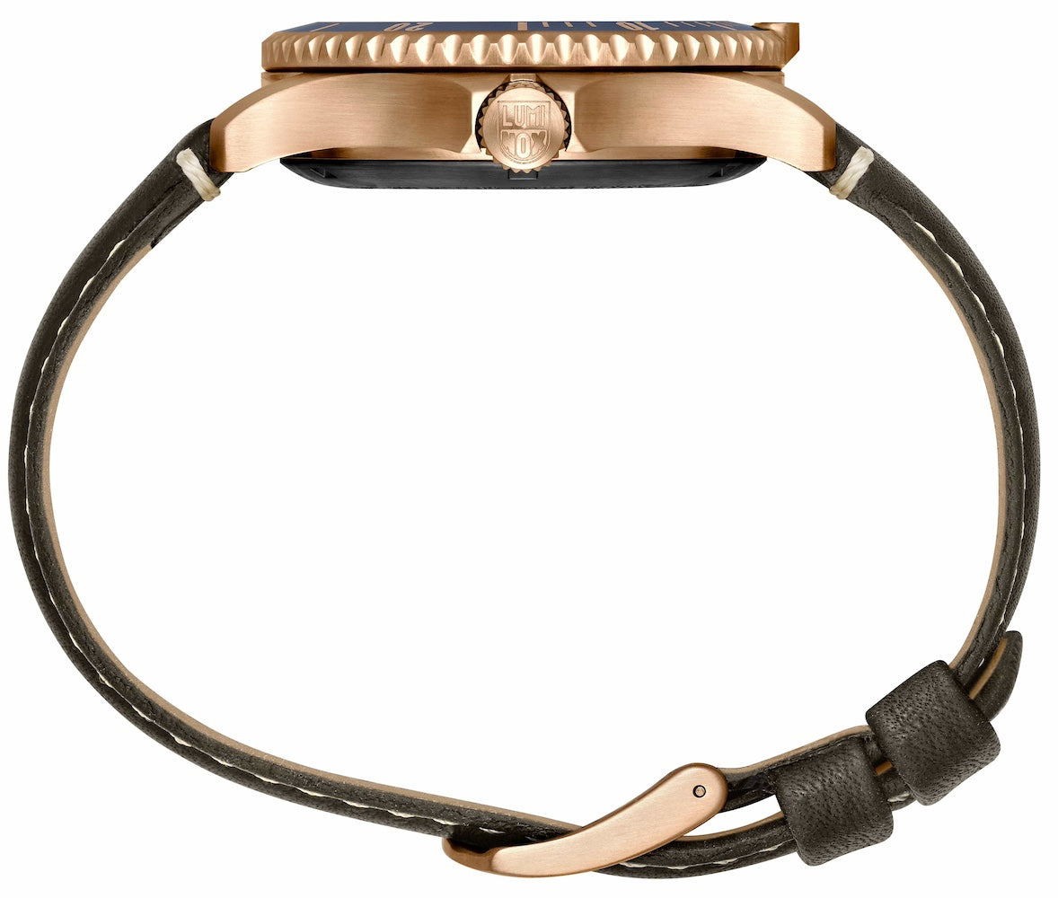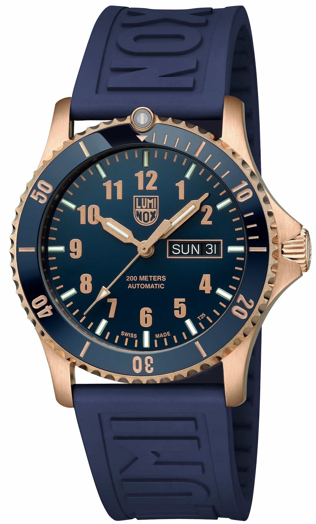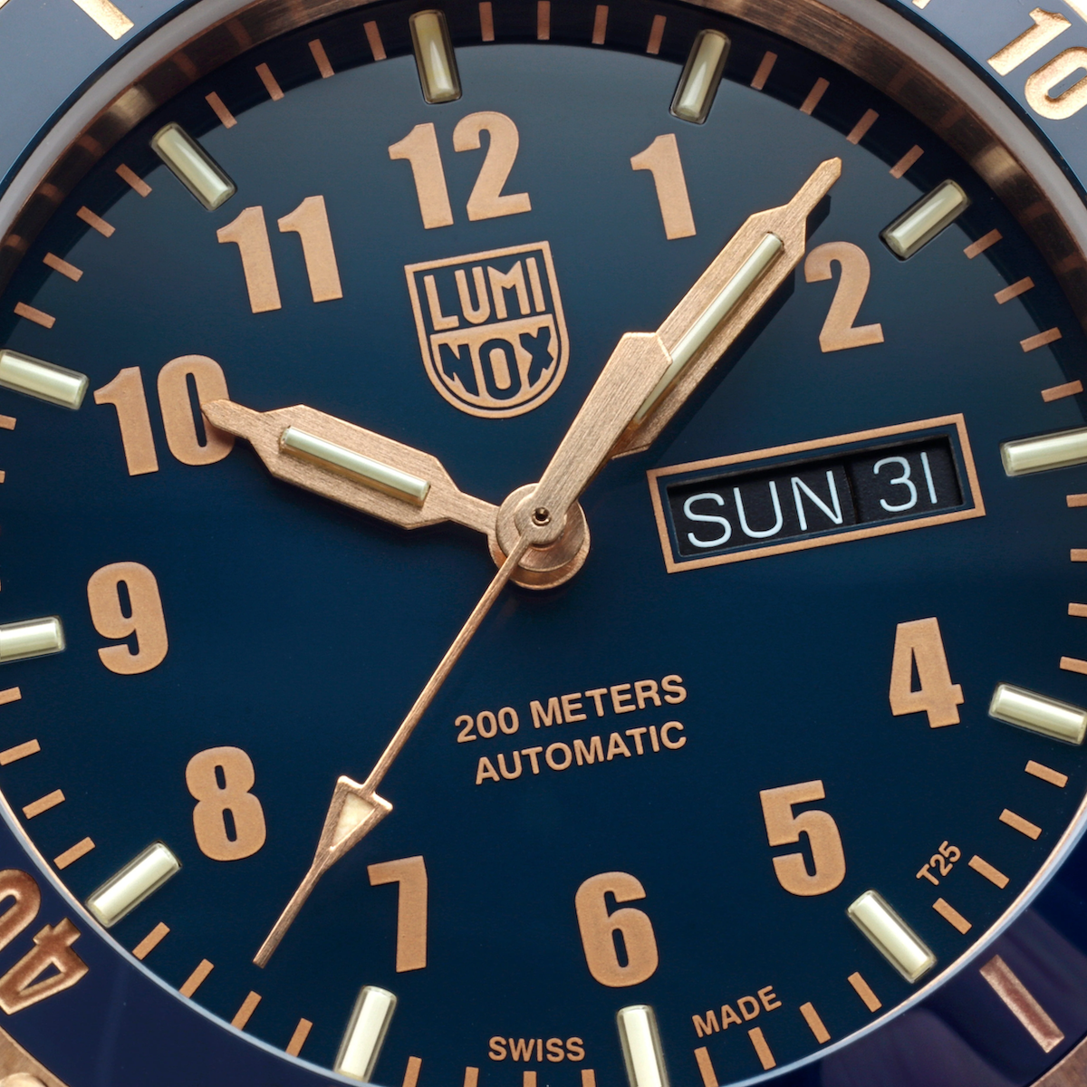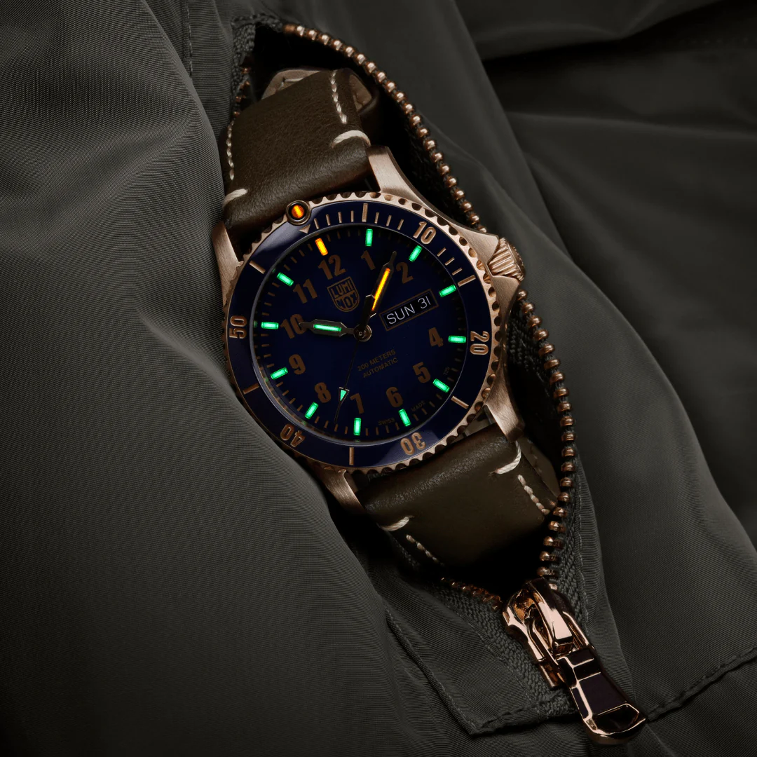 Luminox Watch Sport Timer Automatic Limited Edition XS.0923.SET. It combines an automatic movement with an elegant vintage look. A stunning sunray dial displaying a day date is surrounded by a matching blue bezel ring, coated in ceramic. The limited edition comes as a set with both a brown leather strap and an additional navy-blue cut-to-fit strap, adorned with an IP bronze signature buckle. The two different straps allow for a more sportive and a more elegant look creating great versatility for the wearer. Bronze is a combination of copper which symbolizes luck and tin which represents durability. Perfect for the outdoor explorer.