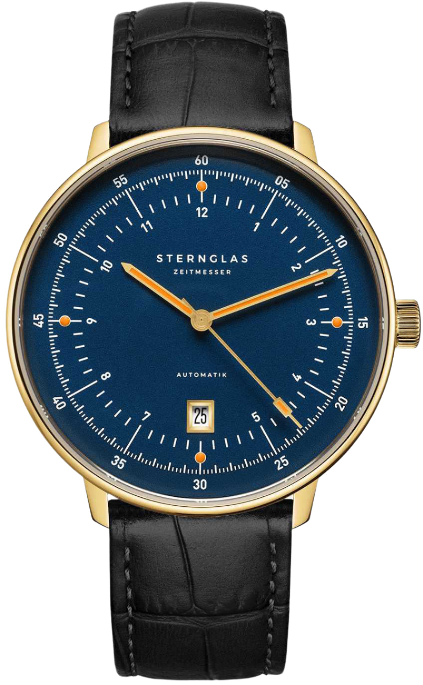 Sternglas Hamburg Automatic Edition Marine Watch S02-HHM07-HE03. The STERNGLAS Hamburg series is not just their tribute to our hometown, it’s also a beloved favorite among our community. With the Hamburg darkblue gold, we’re expanding this collection with a fresh, new design while maintaining its signature Hanseatic charm. This stylish everyday companion impresses not only with its modern aesthetics but also with many fine details. The exclusive design was inspired by the elegant uniform of a naval officer, clearly reflected in the bold ocean blue paired with golden embellishments and insignias. A striking contrast that immediately catches the eye.