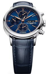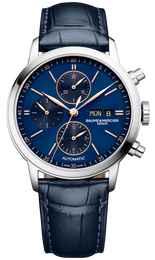 Baume et Mercier Watch Classima Mens 10784. The Classima M0A10784 watch epitomizes sophistication with its meticulously crafted design elements. Featuring a sunburst blue lacquered dial complemented by dark blue sub-dials and delicate golden accents, it exudes elegance. The refined golden indices and leaf-shaped hands add a luxurious touch, while the day and date windows at 3 o'clock offer functional convenience. Housed in a 42mm polished stainless steel case with scratch-resistant sapphire crystals, the watch ensures durability. Its self-winding movement operates at 4 Hz with a 48-hour power reserve, providing reliable performance. With water resistance up to 5 ATM, it's suitable for everyday wear. Accompanied by a blue alligator leather strap with interchangeable stainless steel clasp, it offers both comfort and security.