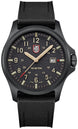 Luminox Watch Atacama Field 43mm Urban Adventure Set XL.1970.SET. This Atacama Field 1970 watch is inspired by its namesake, the Atacama Desert. The design with a black dial with textured finish and sand hour numbers evokes the terrain and rugged landscape of the desert. The timepiece presents a large dial that displays the 12- & 24-hour clock, along with a red tipped second hand and red arrow next to the date at 3 o’clock for instant readability. The dial is protected by sapphire crystal with anti-reflective coating. The 43 mm CARBONOX™ case is matched with a black rubber strap that can also be swapped with the additional second strap that comes with the watch, a sand webbing NATO strap.