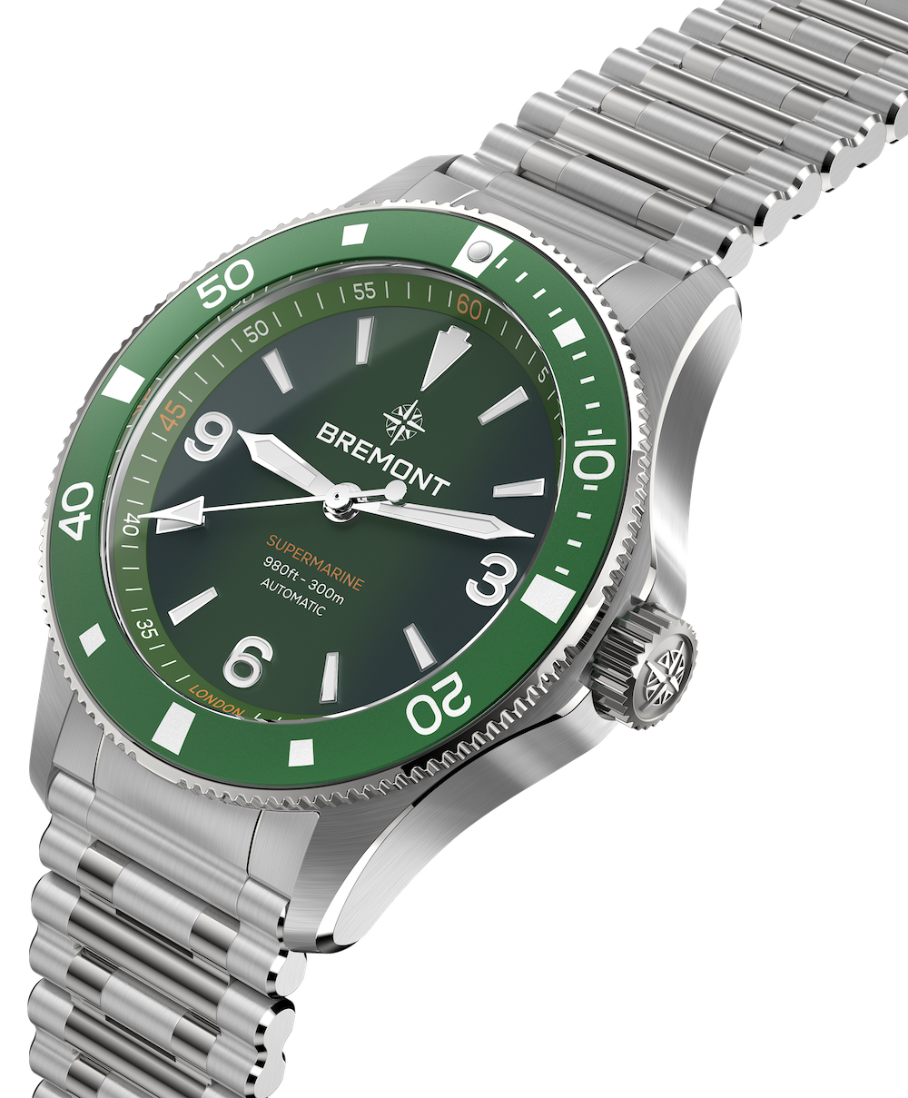 Bremont Watch Supermarine 300M Green Bracelet SM40-ND-SS-GN-B. Over the years, Bremont has developed its Supermarine diving watch collection to the exacting specifications required for professional divers and military personnel, working with the likes of the Royal Navy Clearance Divers, Special Forces Units, North Sea Deep Sea Divers and the Royal Marines. Bremont has also worked closely with open water swimmers, free divers, scuba divers and professional sailing teams to ensure our watches can be relied upon in any marine environment. We are proud to have created a collection of watches which is relied on by the best.