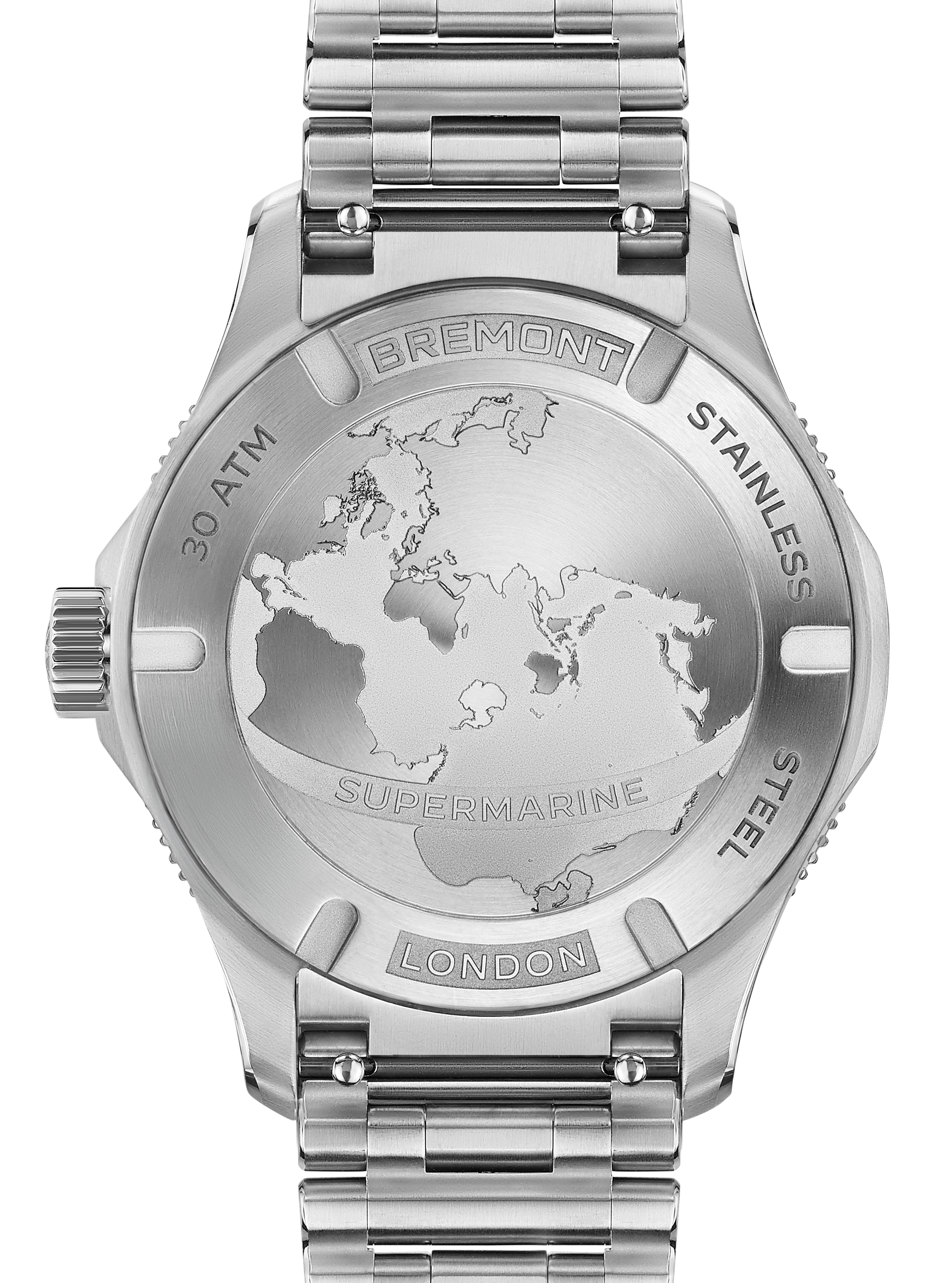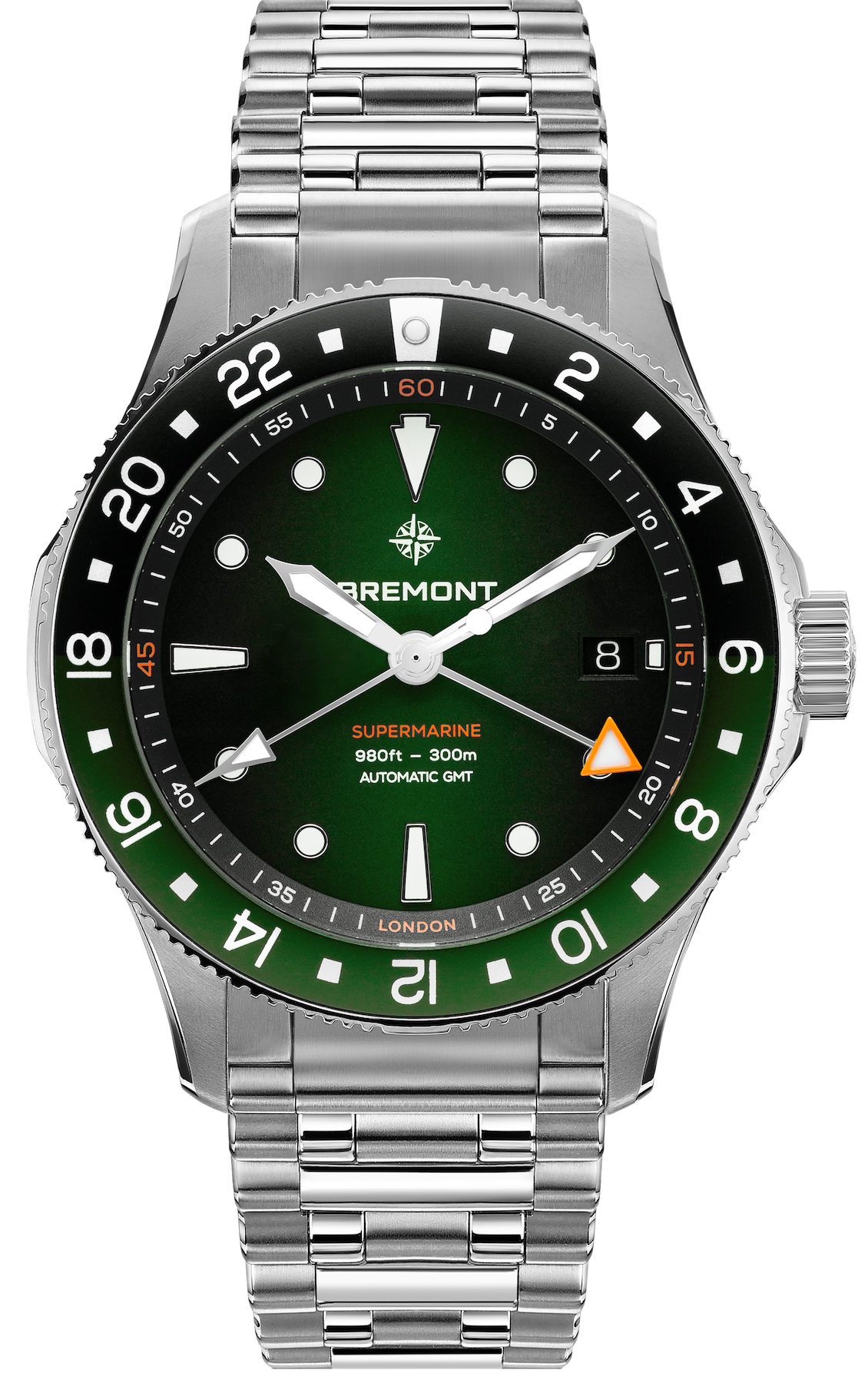 Bremont Watch Supermarine 300M GMT Green Black Bracelet SM40-GMT-SS-GNBK-B. Designed around the principles of Air, Land and Sea, Bremont watches are built to perform in any environment. It is for this reason that they use the highest quality materials and watchmaking techniques available in the construction of our timepieces. Inspired by the significant history of watchmaking on these shores, Bremont are determined to build a contemporary, luxury watch company in Great Britain.