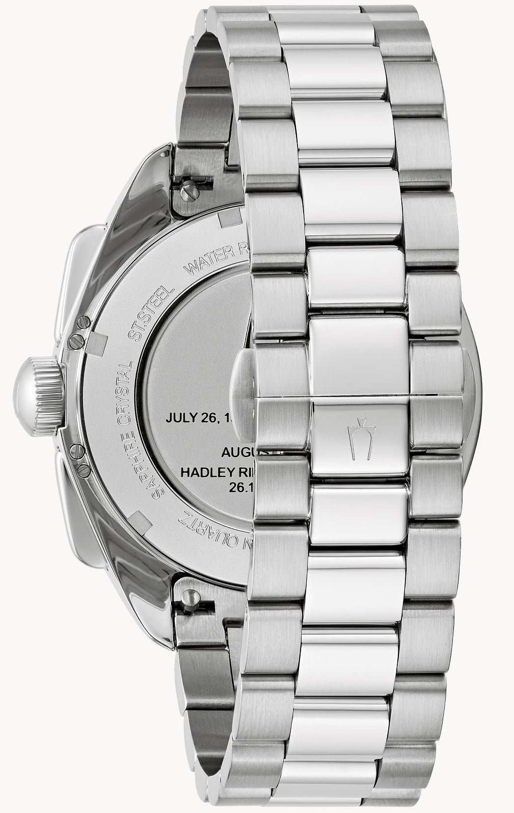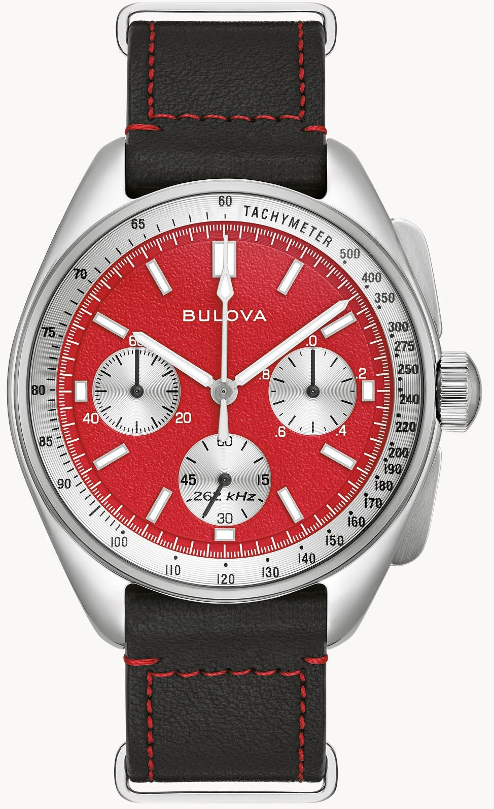 Bulova Watch Lunar Pilot Chronograph Blood Moon 96K115. In 1971, a Bulova chronograph was worn on the moon, engineered by Bulova for the demands of the lunar environment. Now, the iconic design has been updated with our exclusive high precision quartz movement. Continuing Bulova’s legacy of precision timing with heritage-inspired design, the Lunar Pilot chronograph from the Archive Series features a unique dial that reinforces our spacefaring history, and the 43.5mm silver-tone 316L stainless steel polished case, creating a dynamic presence on the wrist. Slim chronograph pushers and a crown featuring the Bulova tuning fork logo are perfectly proportioned and ideally positioned at 3 o’clock. Under the flat sapphire crystal, the six-hand chronograph dial is presented in a unique red and silver “panda style, with a vibrant red inspired by the tone of the moon during a total lunar eclipse, sometimes referred to as a “blood moon. A silver-white tachymeter ring offers contrast around the dial, which features a retro Bulova logo. The slim hands and applied markers offer high legibility and are applied with super-luminous material for low-light display. The silver-white recessed, circular grooved sub-dials include a 1/20 chronograph seconds counter at 3 o’clock, running seconds with a sweep hand at 6 o’clock, and 60-minute chronograph counter at 9 o’clock. Powered by our proprietary high precision quartz technology, resonating at a frequency of 262khz for unparalleled accuracy with a sweeping chronograph hand, this exceptional men’s timepiece is paired with a matching 3-link silver-tone stainless steel bracelet with a push-button deployant clasp and an interchangeable black leather strap with red contrast stitching, both of which feature an easy release system for quick changes. The Lunar Pilot chronograph brings the past to the present with a design from space exploration history, perfect for the modern adventurer.