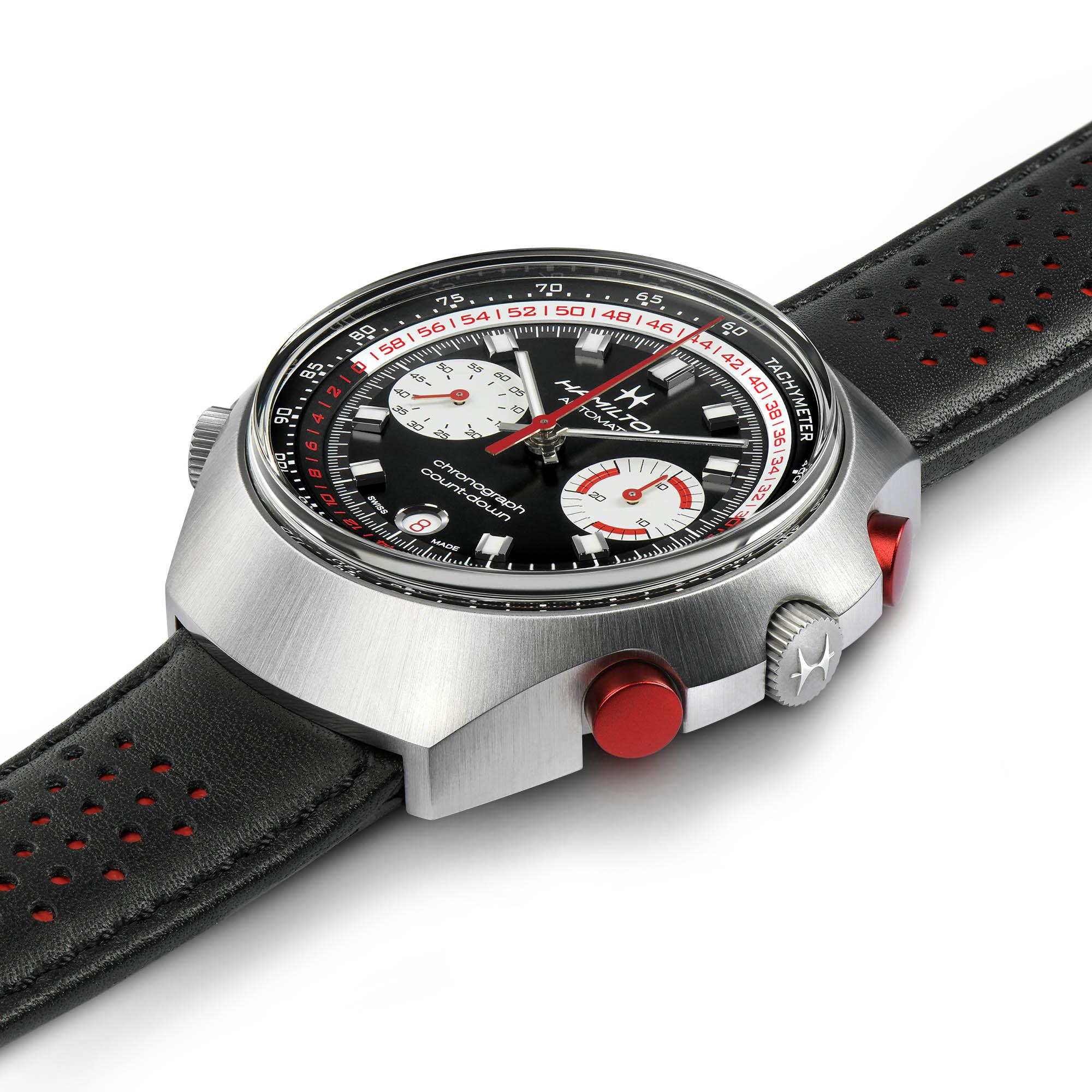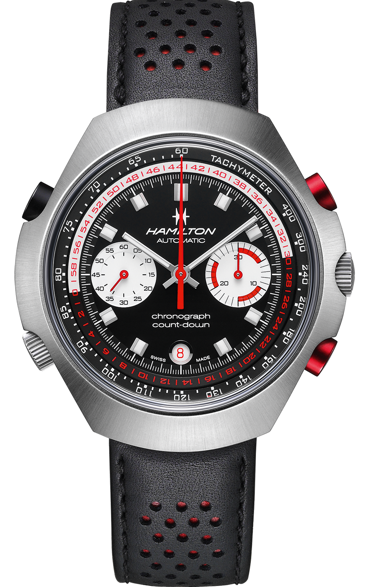 Hamilton Watch American Classic Chrono Matic 50 Limited Edition H51616731. Distinctive, daring and definitely an attention-grabber, the Chrono-Matic 50 is based on the Chrono-Matic E and limited to 1,972 pieces. Powered by the H-31 automatic movement, at 48 mm, it’s not for the faint hearted. The reverse panda dial is a signature Hamilton style statement. Bold red color accents underscore the dynamism of this multifunctional timekeeper which includes a countdown scale.