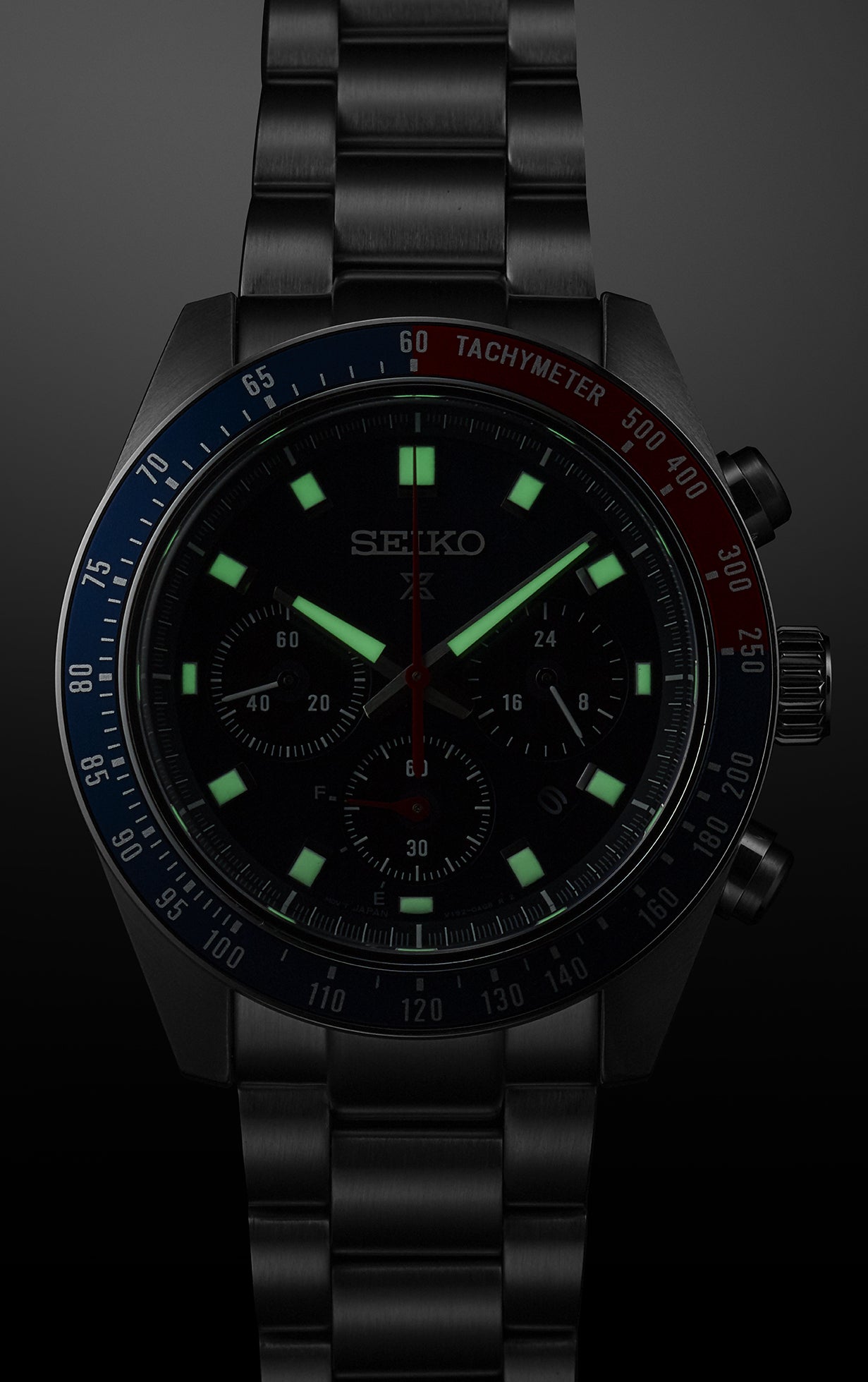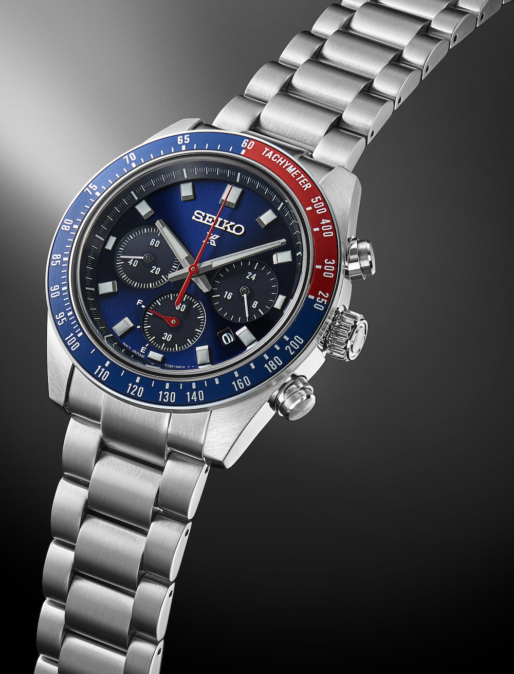 This solar powered chronograph timepiece is from the Prospex Speedtimer watch collection which represents Seiko’s professional timekeeping heritage.