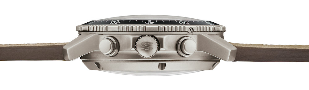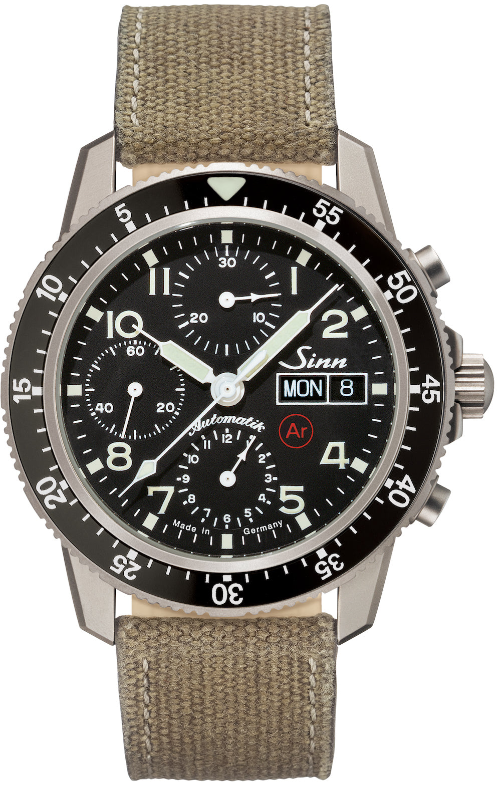 Sinn Watch 103 Ti Ar Titanium Canvas Beige 103.071 Canvas Beige. The pilot chronograph 103 Ti Ar once again serves as proof of how first-class technology and functional design can unite to yield a true classic. The design principles for aircraft instruments served as inspiration for its development. This is no coincidence – after all, both professional pilot chronographs and aircraft cockpit clocks were the first timepieces our company made. The technical features range from the captive pilot’s bezel with minute ratcheting to the Ar Dehumidifying Technology for enhanced functional reliability and freedom from fogging. The bead-blasted case is made of pure titanium, which underlines the technical and contemporary interpretation of the watch and ensures a comfortable fit.