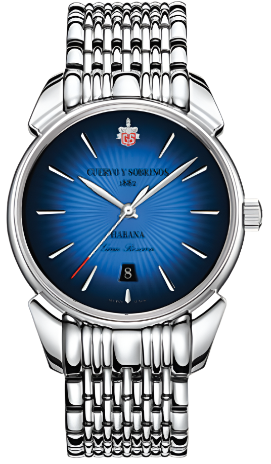 The Gran Reserva watch collection by Cuervo Y Sobrinos is where the vivacity of Old Havana dances hand in hand with the rigorous precision of Swiss watchmaking. These elegantly crafted dials are masterfully crafted to provide an interplay of colour and light. Each meticulous dial features a sunray guilloche effect and a fume effect colour composition that sees the centre of each dial transitioning into a different shade towards the periphery. In this example, the Historiador Gran Reserva watch reference 3101B.1GRB, Cuervo Y Sobrinos chooses a vivid blue colour and equips the hands and hour markers with a fine treatment of Super LumiNova for improved legibility in the dark.