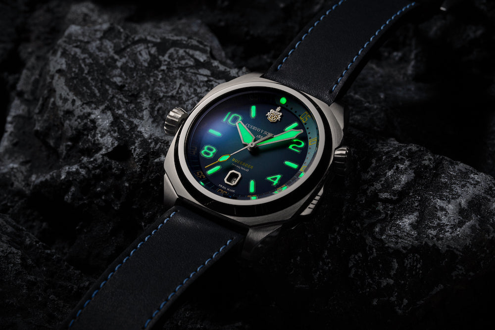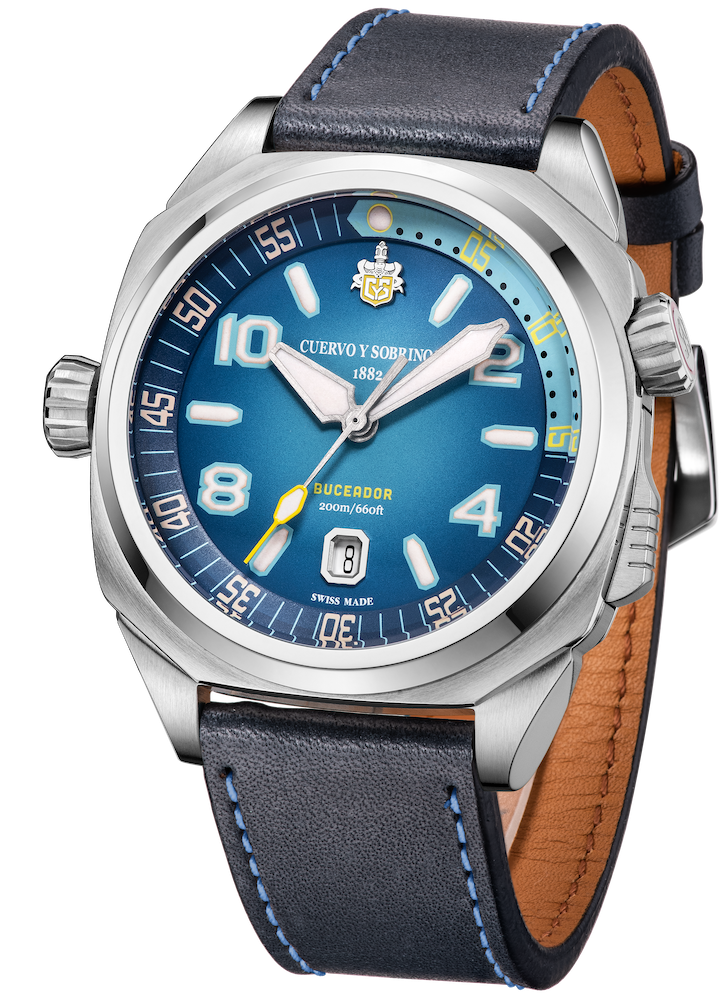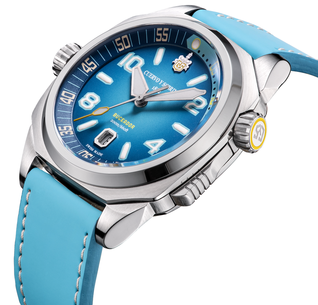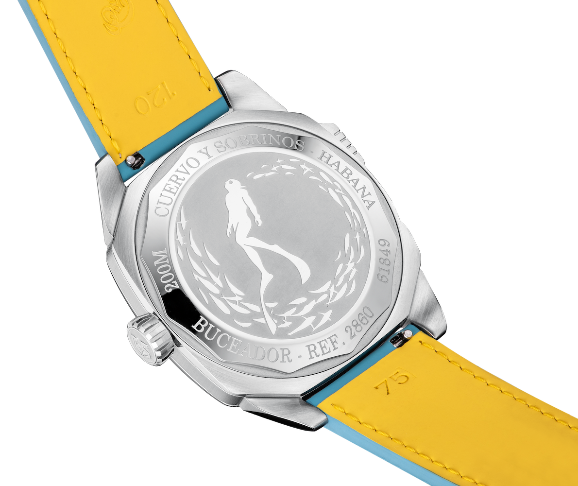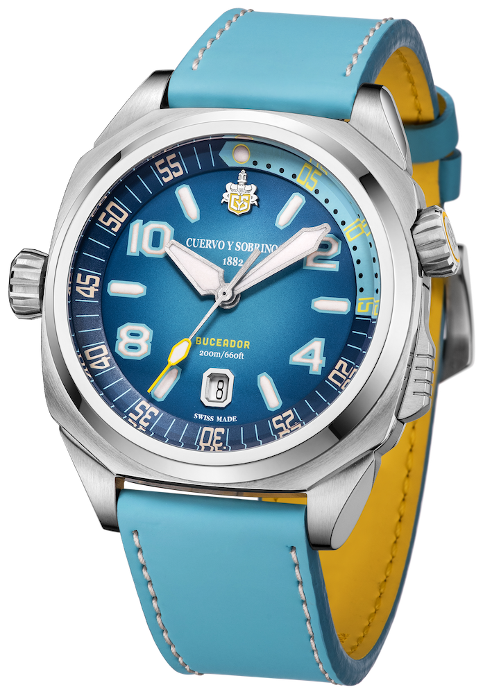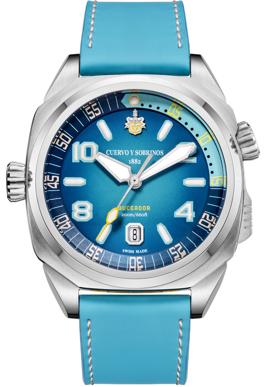 Cuervo y Sobrinos Watch Buceador Caribe Divers Varadero Beach 2860.1AZ. The Cuervo y Sobrinos watches Buceador Caribe, a divers watch inspired by cyan coloured seas, pastel sands and Cubas aquatic world. It has a highly complex case featuring a container type construction that contributes to the models impressive water resistance of 200m. This contemporary watch, brimming with Caribbean charm, is both practical and stylish.
