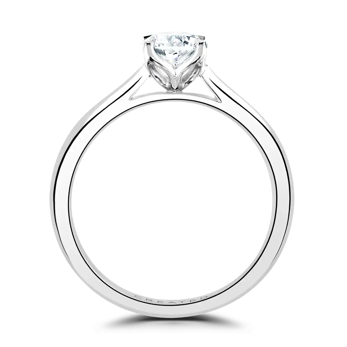 Timeless diamond engagement ring featuring a four-claw floral bloom setting and a 1ct bright white D/E colour oval cut laboratory grown diamond. Handcrafted in the UK, shown here in platinum.