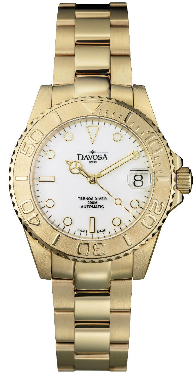 Davosa Watch Ternos Medium Automatic 16619820. The Ternos Medium has the very same quality characteristics of the Ternos Ceramic; it only differs in its dimensions. The case has a diameter of 36.5 mm and a height of 11.8 mm, and is thus more suited to a narrower wrist. Its components include a scratch-resistant, transparent, anti-reflective sapphire crystal; a meticulously crafted stainless steel case capable of withstanding pressures of 20 ATM; a precise Swiss DAV 3021 automatic movement, ensuring long-lasting, functional reliability. The design is very subtle for a sporty diver’s watch and truly deserves the ‘classic timeless’ attribute – the Ternos not only cuts a fine figure over a wetsuit, but looks stylish in combination with a single-breasted business suit.