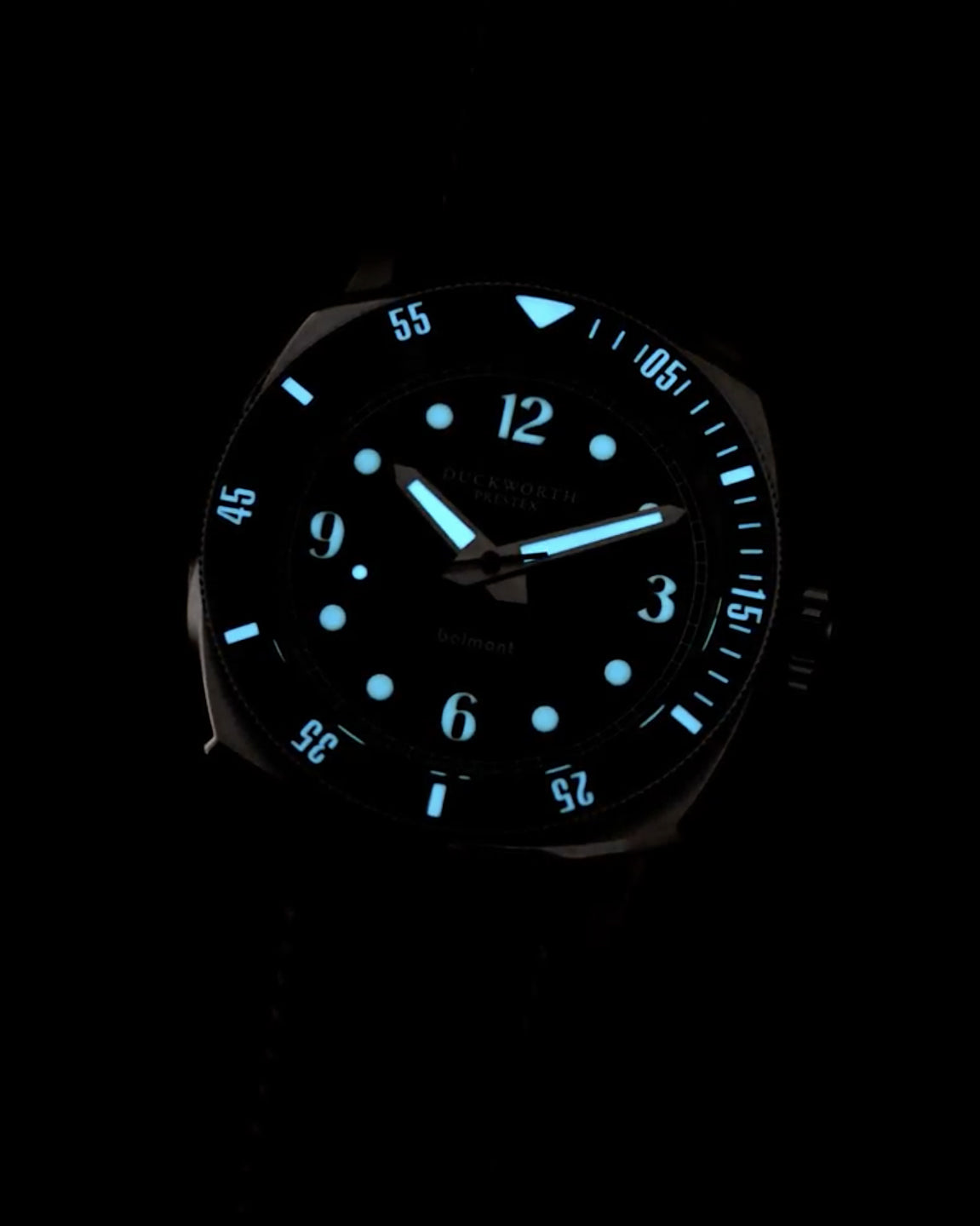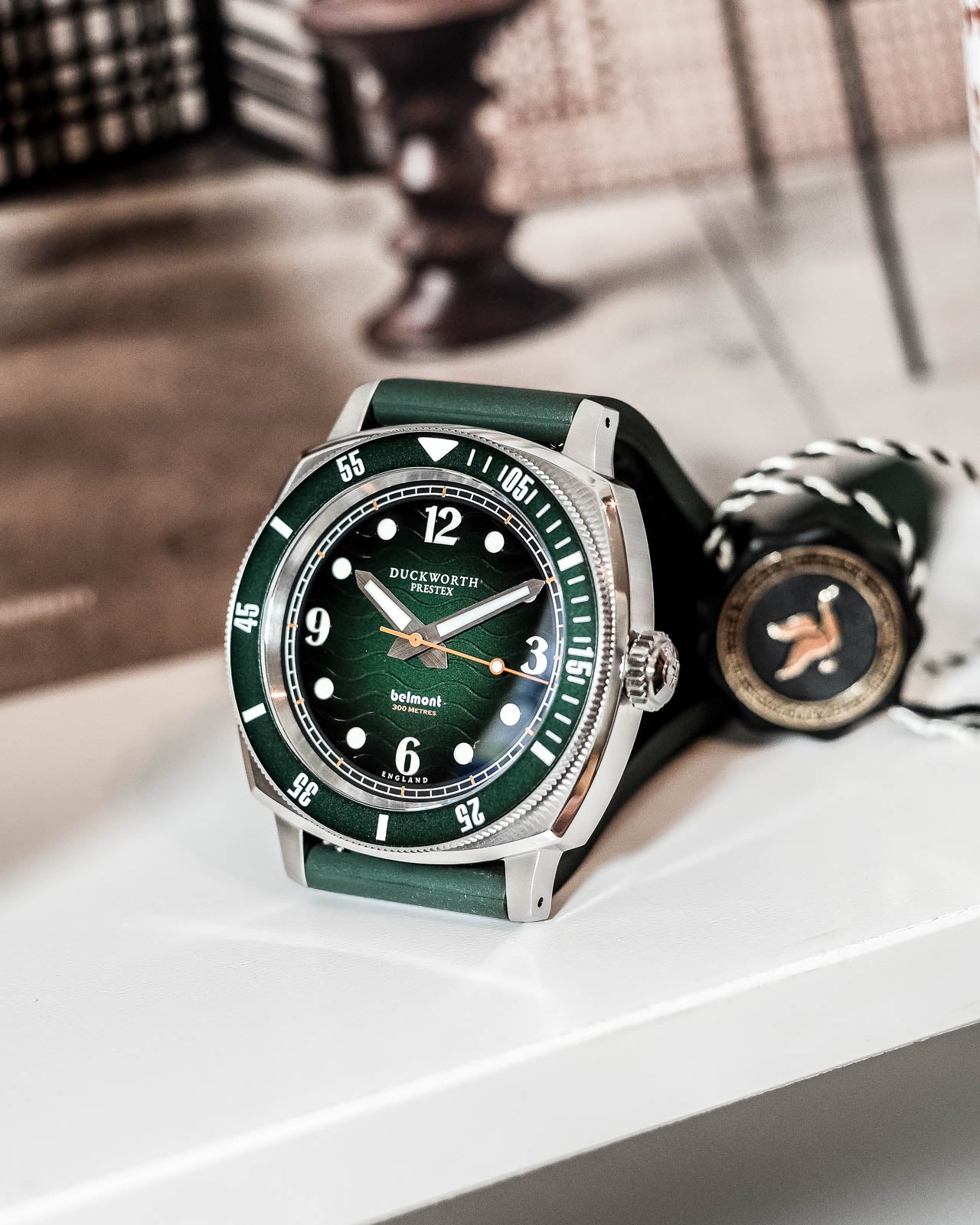 Duckworth Prestex Watch Belmont Dive Green Rubber D328-03-ER. The retro cushion-style case is constructed out of durable 316L brushed stainless steel. The Belmont is water resistant to 300m.