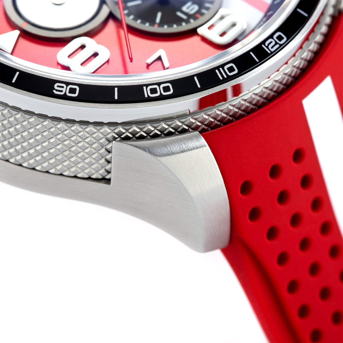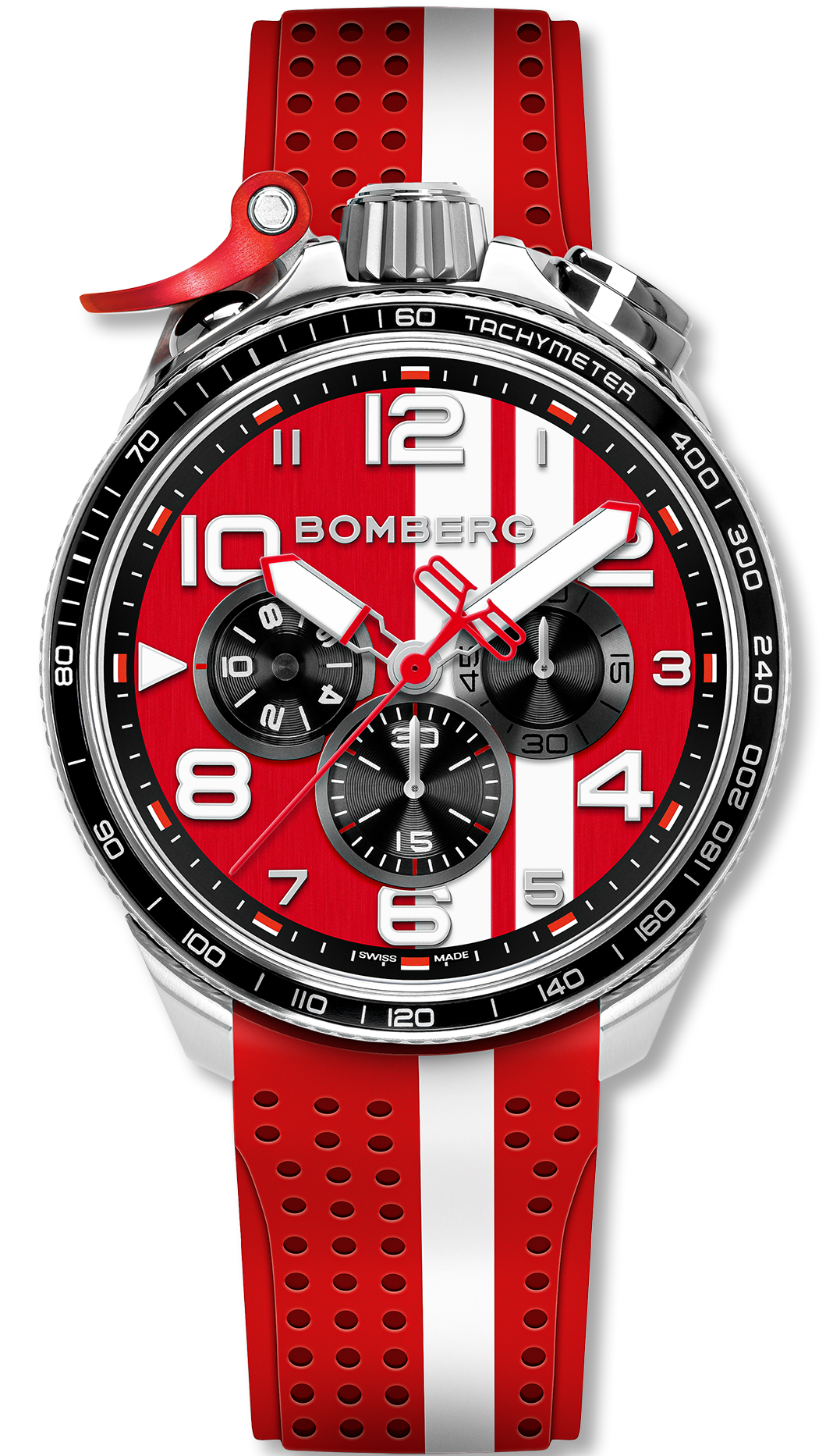 Bomberg Watch Bolt-68 Racing 4.3 BS45CHSP.059-23.12. Each watch in the Bomberg watches Racing collection features identifiable racing stripes across the dial and strap, enhancing the vintage racing aesthetic. These timepieces are equipped with a 1/10th of a second chronograph function and a unique chronograph trigger for precise timekeeping. The versatile design includes a removable case that transforms the watch into a pocket watch, complete with an included chain and fob. The knurled stainless-steel case and sapphire crystal ensure maximum scratch resistance, while the comfortable silicone strap guarantees a perfect fit for all day wear.