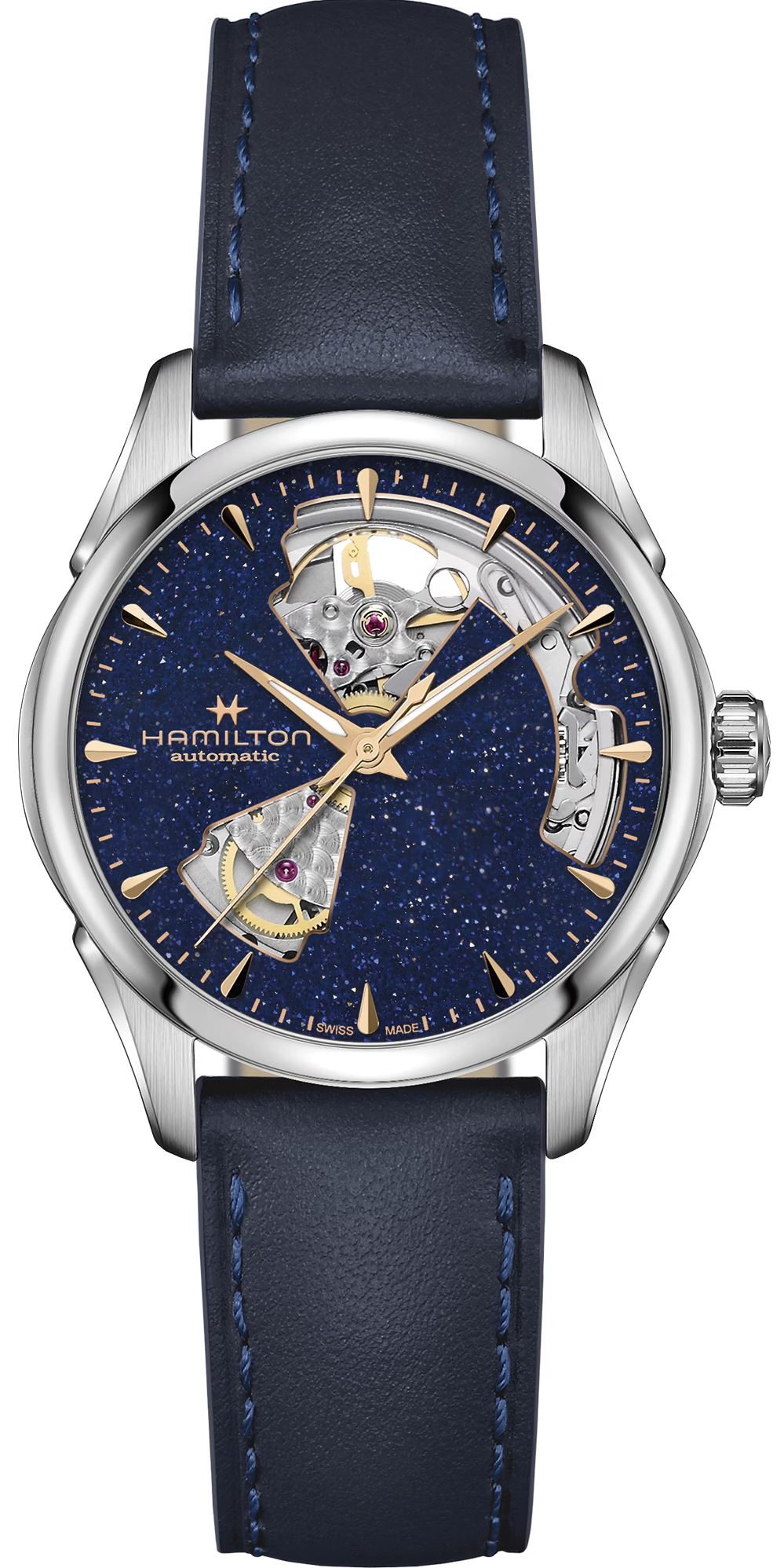 The midnight blue dial of this elegant Hamilton Jazzmaster watch sparkles underneath the light, providing the wearer with a unique and captivating way to read the time. Designed for the female wrist, the Hamilton Jazzmaster Open Heart Lady Auto watch reference H32215642 measures a 36mm diameter and secures comfortably to the wrist with a comfortable, supple blue calf leather band. Combining the artistry of Hamilton’s heritage and the skills acquired by the watchmakers at the brand’s atelier, this exquisite timepiece is as timeless as it is contemporary.