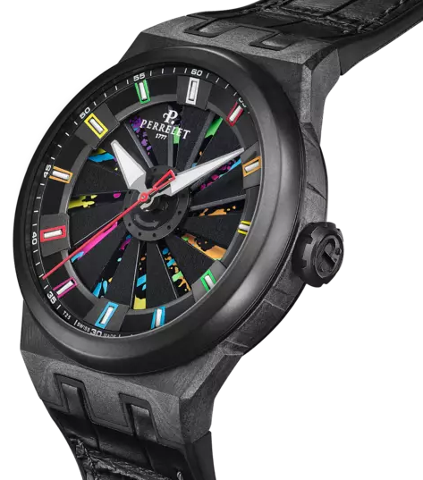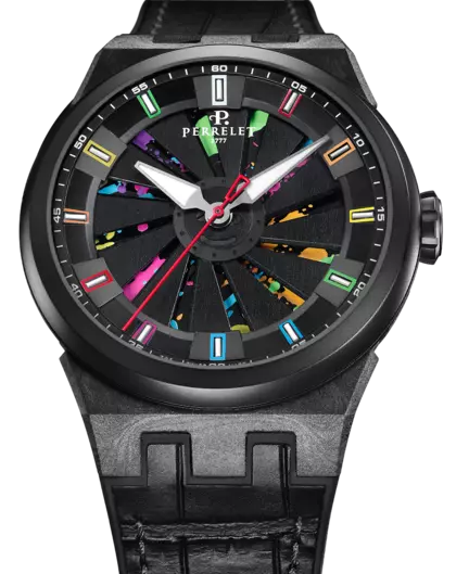 Perrelet Watch Turbine Splash Limited Edition A8003/2. Explore unrestrained creativity with the Perrelet "Turbine Splash". Inspired by Jackson Pollock's "action painting" techniques, this watch stands out with its dial adorned with splashes of paint in vibrant colors such as neon green, yellow, violet, fuchsia, light blue, and orange, all set against a black background that captures a unique visual energy. Its characteristic turbine, featuring 12 black anodized aluminum blades, reveals bursts of color with every wrist movement, showcasing engineering and design that go beyond the conventional.