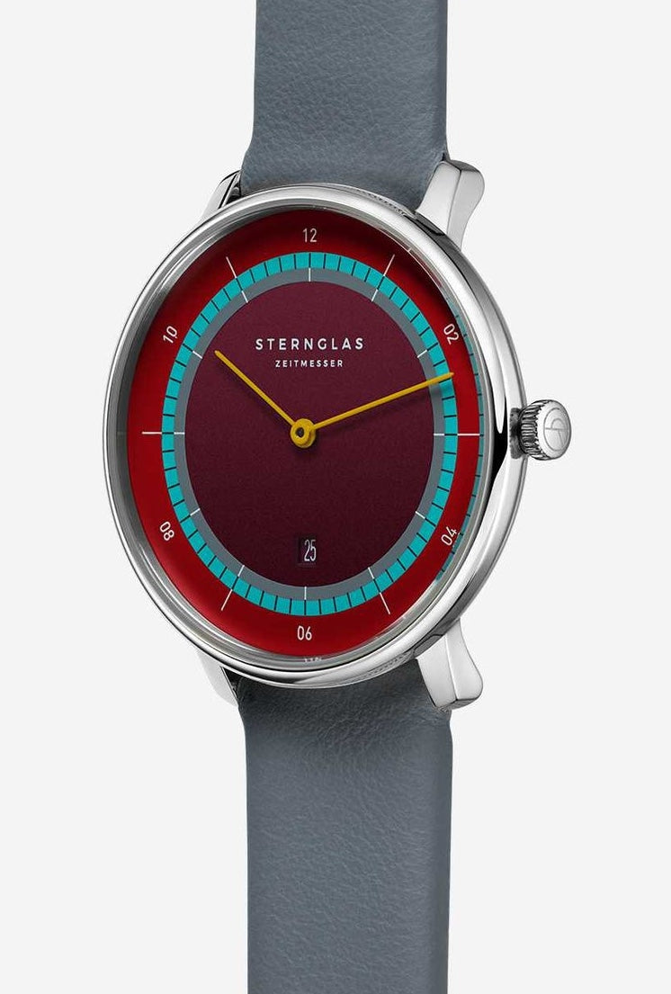 Sternglas Watch Naos XS Edition Argo Red S01-NDA24-KL10. For a long time STERNGLAS watches have been asked for a swimming and diving watch. Several prototypes later Sternglas can now present their first timepiece in this distinctive style. In order to achieve a particular high water resistance the case back and the crown are screwed. The watch case is manufactured using high quality steel and equipped with Sapphire Glass. As a visual highlight you find on the reverse an engraving of an abstracted seabed.