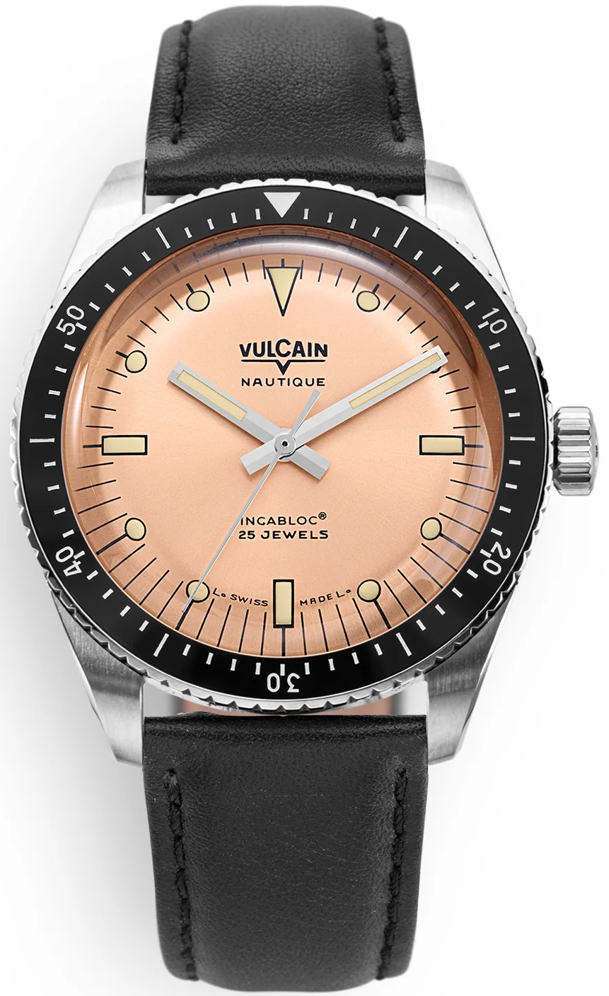 Vulcain Watch Skindiver Nautique Salmon Black Leather Limited Edition 660170B87.BAC201. Think Vulcain and the first thing that comes to mind is Cricket. That would be selling the brand short; Vulcain is a treasure trove of watchmaking sleeping beauties that resonate with a nostalgic vibe. The SkindiverNautique is all set to make a splash in the vintage-like market. Inspired by a Vulcain model launched in 1960, it is powered by ETA’s 2824 three-hand Swiss automatic caliber with a 38-hour power reserve, the workhorse among the famed movement maker’s range of mechanical calibers.