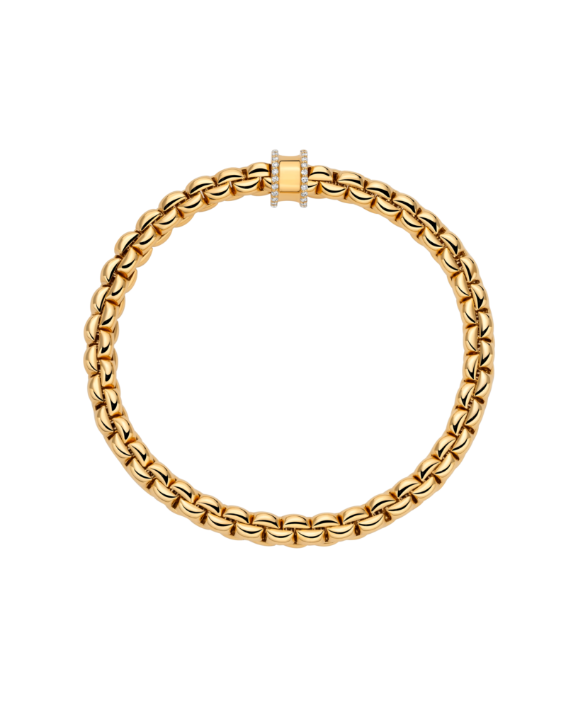 Crafted from 18ct yellow gold, the Fope Flex'it Bracelet features a stunning 0.17ct diamond pavé, showcasing expert craftsmanship and luxurious style.