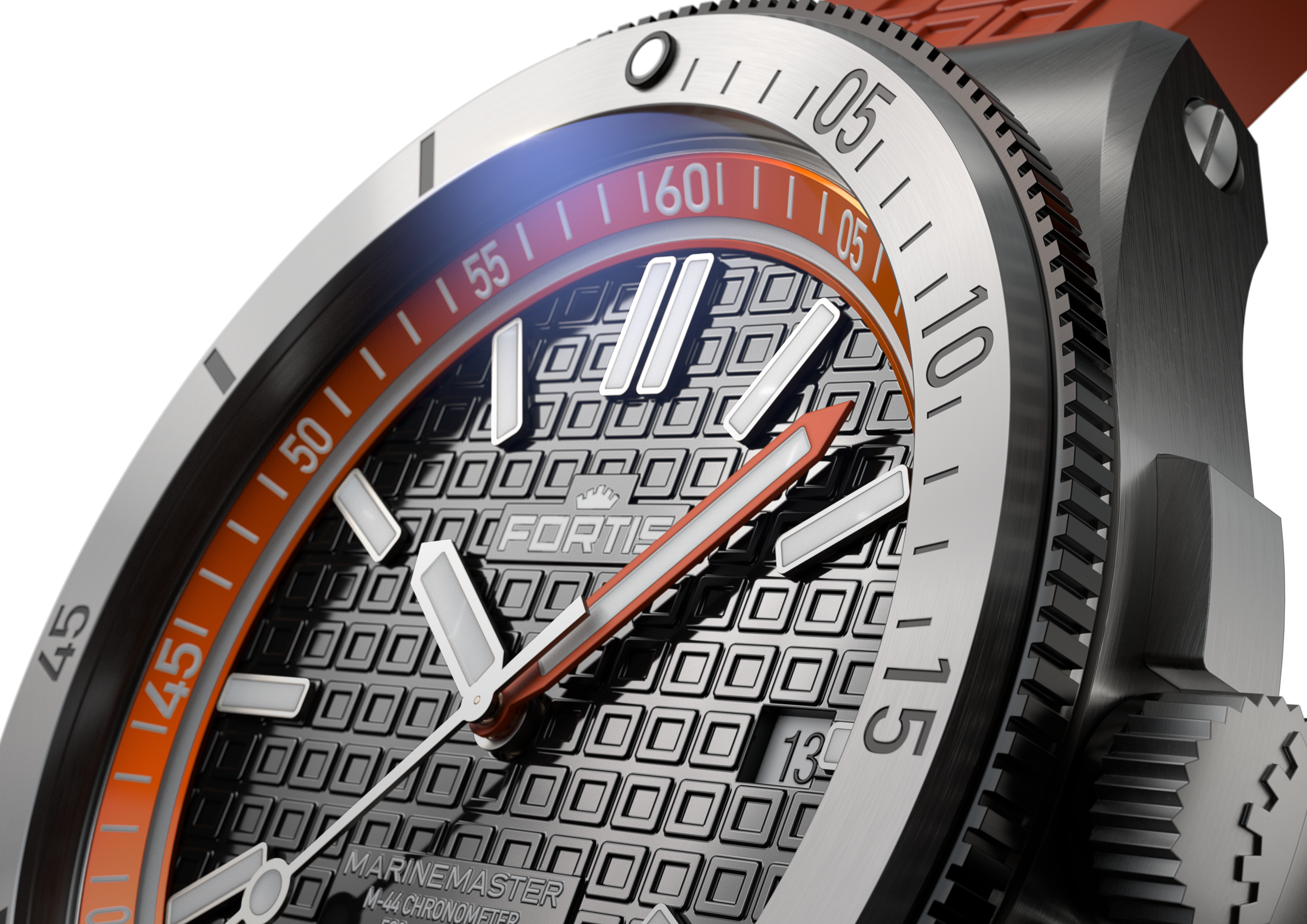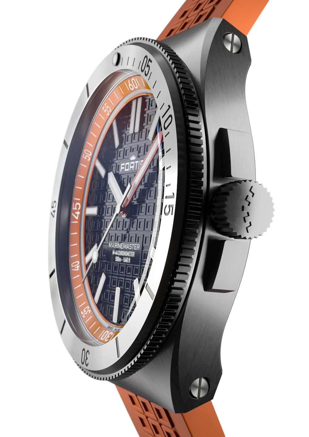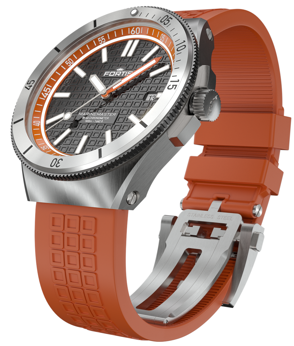 Fortis Watch Marinemaster M-44 Amber Orange F8120013. Inspired by nature, the new Marinemaster collection presents itself in a colourful, robust and sturdy design with a lot of love to detail and functionality. Whether while fi shing, windsurfi ng, hiking or camping, the new Marinemaster is the perfect companion for any outdoor adventure. Connecting to nature, life and the horizon. The new collection consists of two Models and fi ve colours inspired by nature: Marinemaster M-40 is available in Rockstone Gray, Woodpecker Green, Serenity Blue and Snow White while Marinemaster M-44 stuns in Amber Orange. The dials feature hand applied indices and logo saturated in Superluminova X1 and the pattern gently mirrors the Fortis “O. As a first in the watch industry Fortis have introduced recycled steel to redefine their toolwatches. This mindset of sustainability continues with the new Marinemaster collection. The newly designed Horizon Strap comes in a sporty look and comfortably connects the wrist, the watch and the horizon. All models are also available with the stainless-steel Block Bracelet and the Slide Clasp. Made to inspire the wearer to shift down a few gears, the new Marinemaster features the Gear Bezel, the most gripping and functional tool watch bezel ever designed. The M-44 is equipped with a bidirectional Gear Bezel and features the Fortis Lock System The new Marinemaster M-40 is powered by the chronometer-standard, automatic UW-30 Performance, while the Marinemaster M-44 has been equipped with WERK 11, the COSC certifi ed Kenissi manufacture calibre with a 70hr power reserve.