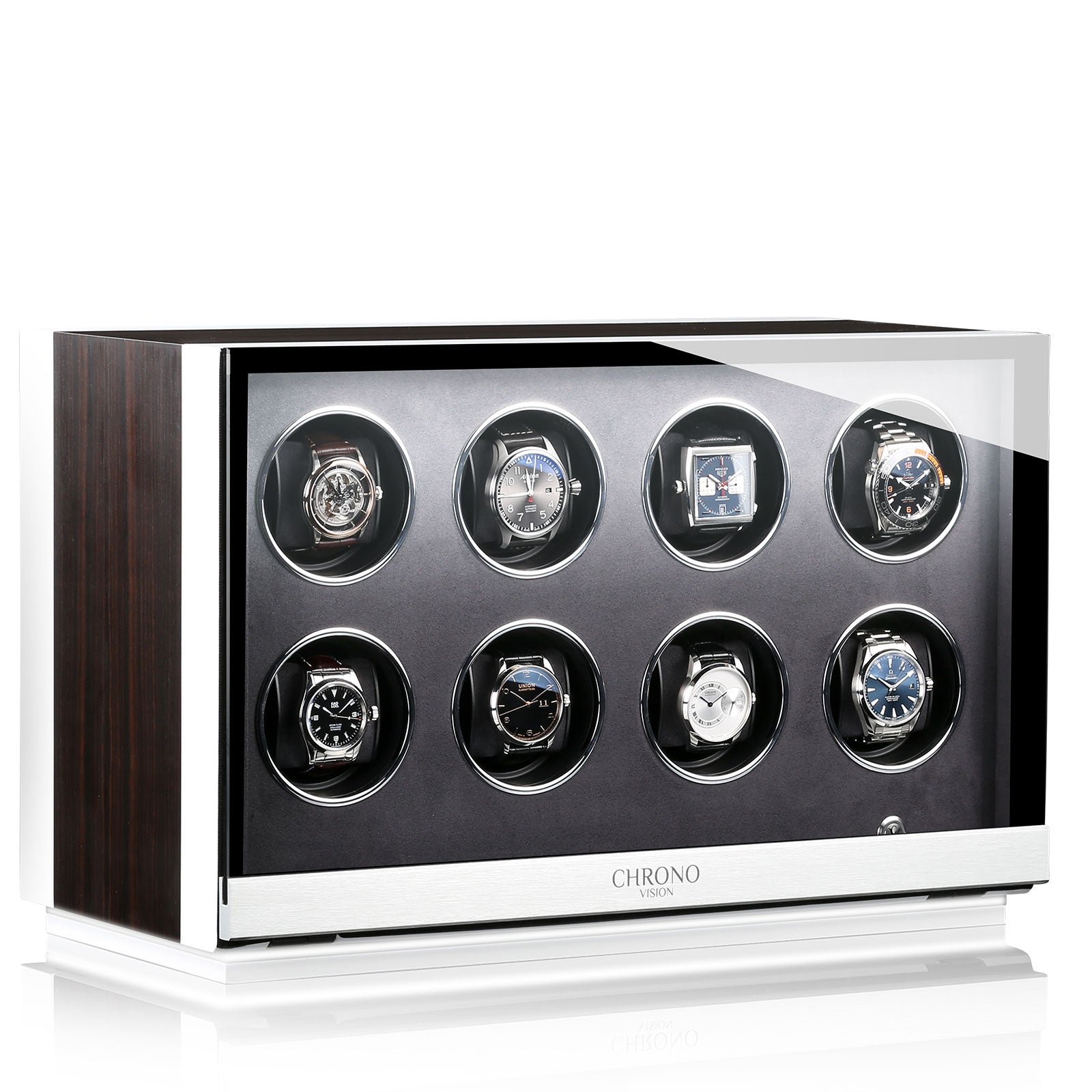 Chronovision Watch Winder Ambiance VIII Ebony Silk White Silk 70050-153.18.12. Discover our sophisticated range of Chronovision Watch Winders which showcase exceedingly low noise motion, a variety of winding directions, intelligent sleep phase and Bluetooth software. Each Chronovision Watch Winder features a range of settings and functions, which includes a full range of speed settings and options for multi directional rotation.