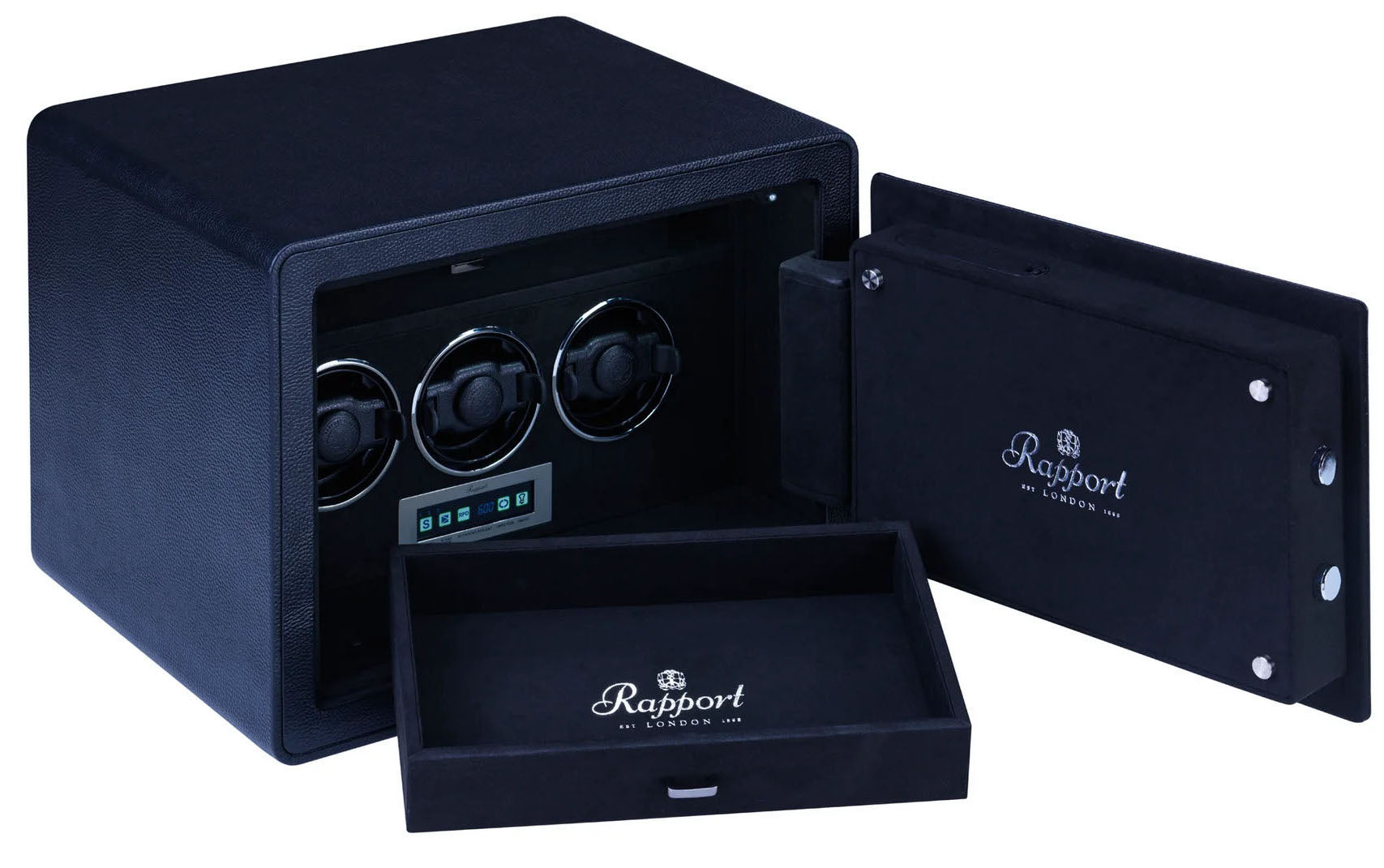 Rapport Watch Winder Savoy 3 Black W651. The Savoy watch winder safe is a specialised storage solution designed to securely store and maintain automatic watches. It combines the functionality of a watch winder, which keeps automatic watches wound and ready for use, with the security features of a safe, ensuring that your valuable timepieces are protected from theft, damage, and environmental factors. The Savoy  watch winder safes come with an additional compartments for storing other valuable items such as jewellery, documents, or other accessories. The safe uses latest technology with fingerprint access and LCD touchscreen control.
