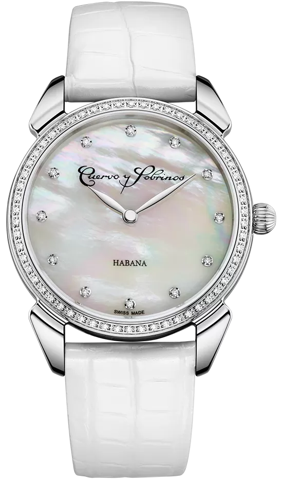 Cuervo y Sobrinos Watch Historiador Primera Dama Diamond White 3113.1W-S1. The Cuervo y Sobrinos Historiador Primera Dama is inspired by the Golden years of Havana. The “Pearl of the Caribbean, at the end of the 19th century, was a privileged center of luxury and the beautiful world: a universe of glamour, luxury, music and dancing that attracted people for all continents. Feminine and elegant, inspired by the Art deco movement of the those years, this ladies' watch, which features numerous appealing details, is suitable for any occasion.