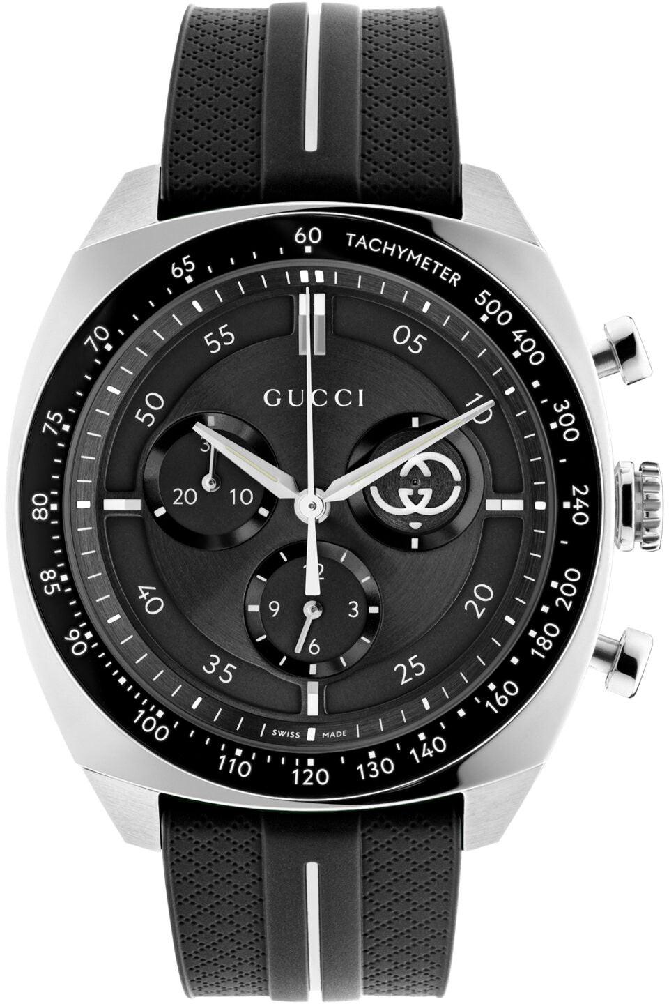 This Gucci Interlocking G watch reference YA142320 bears the recognisable cushion shaped profile and has been crafted from stainless steel. Measuring a 41mm diameter, Gucci experts top the watch with a sapphire crystal glass front and serve the watch with a black chronograph dial for measuring elapsed time whilst on the go. The three chronograph sub counters at 3, 6 and 9 o’clock, the former of which is decorated with an image of the Interlocking G logo, are framed by a tachymeter scale for measuring speed based on distance. This quartz powered chronograph watch from the Gucci Interlocking G watch collection is finished on a black rubber strap with a traditional steel pin buckle.