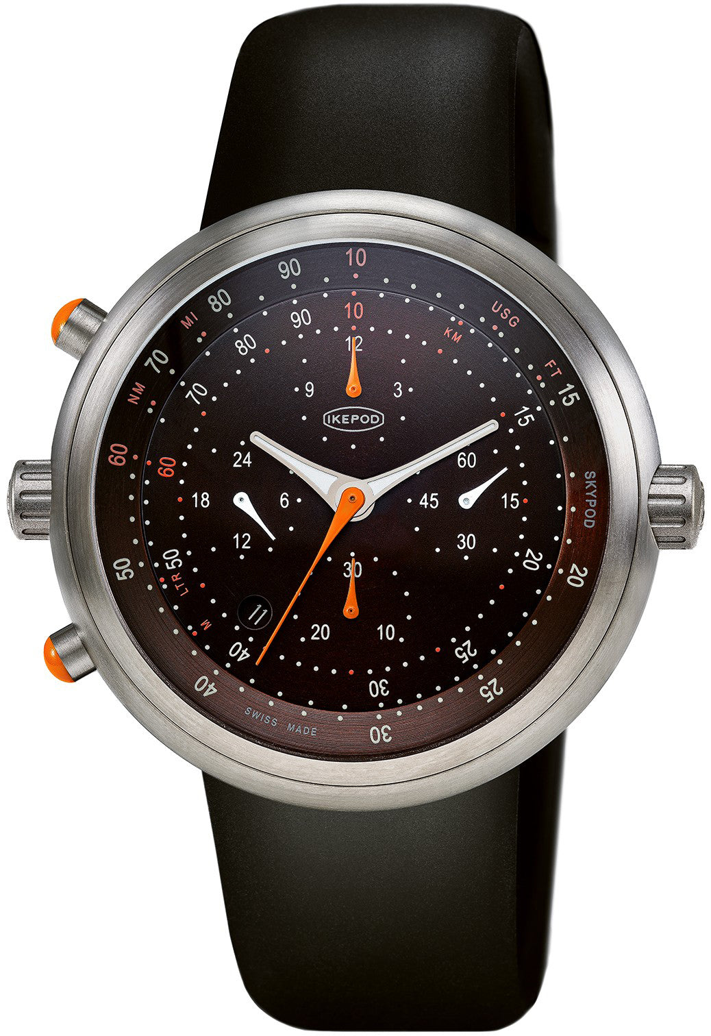 Ikepod Watch Skypod Ola Brown Limited Edition SK03-RP-LB. In line with iconic Megapode Chronograph, using New Old Stock Swiss La Joux - Perret movements, Skypod is a limited edition in Titanium with rubber pin strap. Case assembled by the top like gen1 and gen2 Ikepod & technically improved with dials designed by CLAESSON KOIVISTO RUNE