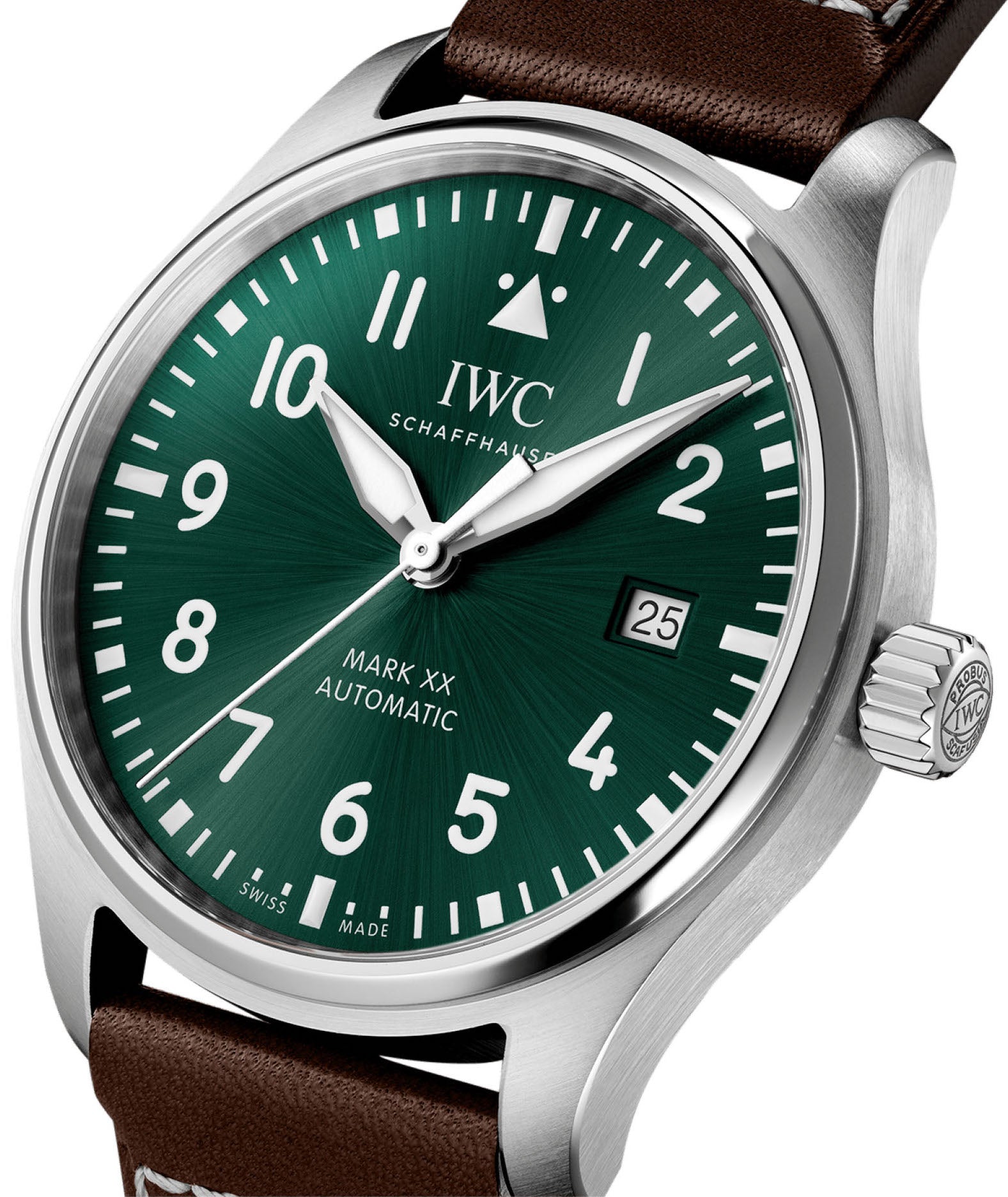 Less is more: the Mark XX reduces the design and technical functionality of a pilot's watch to its pure essence. It is the successor to the legendary Mark 11, a precise amagnetic instrument watch IWC developed in 1948 for the navigators and pilots of the British Royal Air Force. This version features a robust and corrosion-resistant stainless steel case with a diameter of 40 millimeters, a green dial, and rhodium-plated hands. The high-contrast dial with white numerals and indices, the triangular index at 12 o'clock, and luminous elements ensure easy readability in all lighting conditions. Precision is ensured by the IWC-manufactured 32111 caliber with automatic winding and a power reserve of 120 hours. The front glass is specially secured so that it cannot detach from its place even in the event of a sudden pressure drop. The Pilot's Watch Mark XX is water-resistant to 10 bar and is fitted on a brown calfskin strap with a pin buckle. Thanks to the integrated EasX-CHANGE® system, the strap can be easily exchanged for another without additional tools.