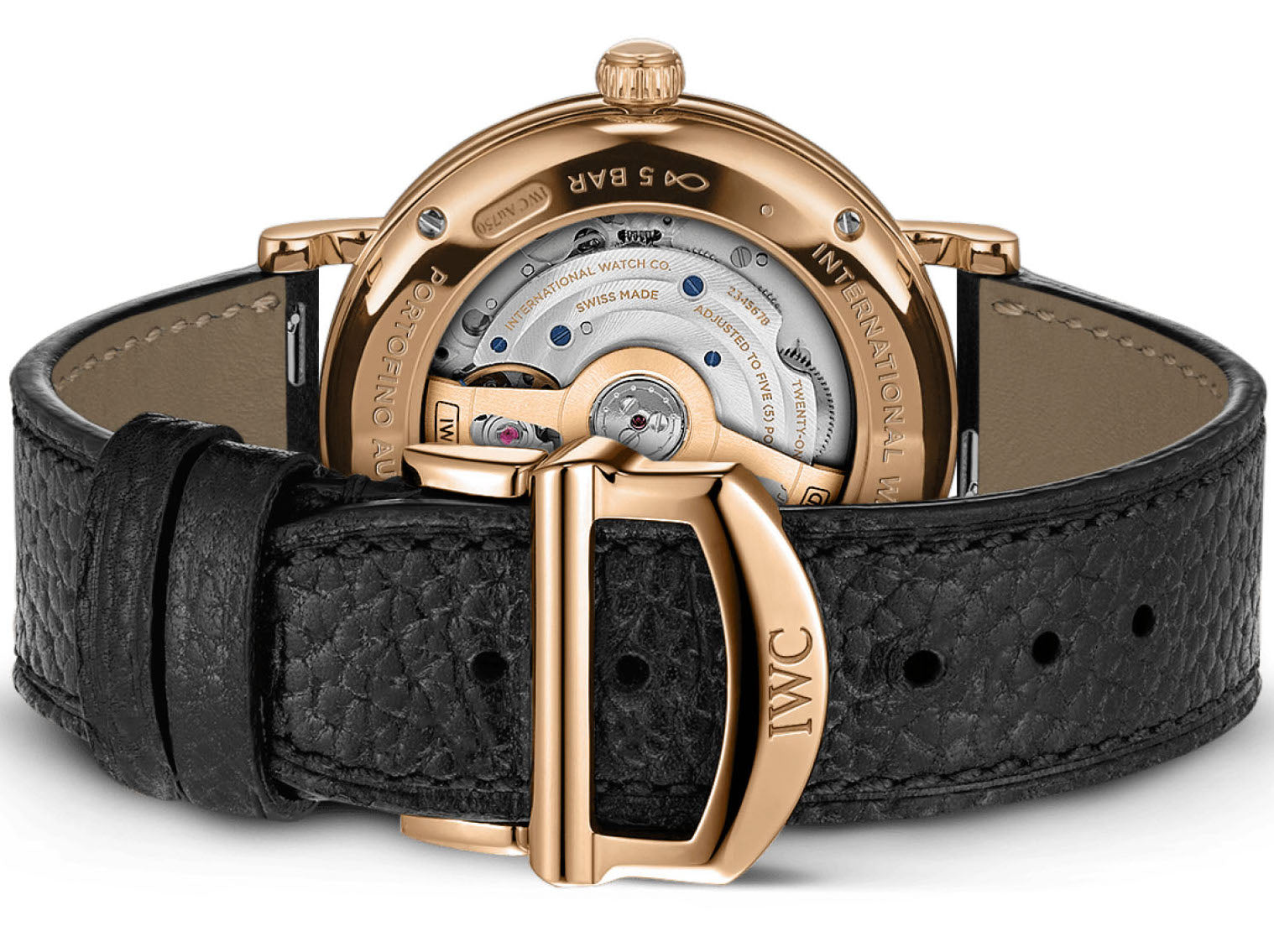 With its reduced case diameter of 37 millimetres, the Portofino Automatic 37 has become a staple in IWC’s ladies’ watches portfolio, offering excellent wearing comfort on more slender wrists. The version features a case made of 18-carat 5N gold, a silver-plated dial, and gold-plated hands and appliques. The case and the dial are decorated with 72 diamonds weighing 1.12 carats. Because of an improved setting, the diamonds reflect the light better and have a more visible presence and added brilliance. At work inside is the IWC-manufactured 32111 calibre, which uses a bidirectional pawl winding system to build up a power reserve of 120 hours. A see-through sapphire glass back displays the movement, which has been finished with a gold-plated rotor and blued screws. This ladies’ watch is fitted with a black strap made of fully traceable Swiss calf leather. The strap has a natural and soft finish and boasts a contemporary, luxurious feel. Thanks to the integrated quick-change system, the strap can be exchanged easily.