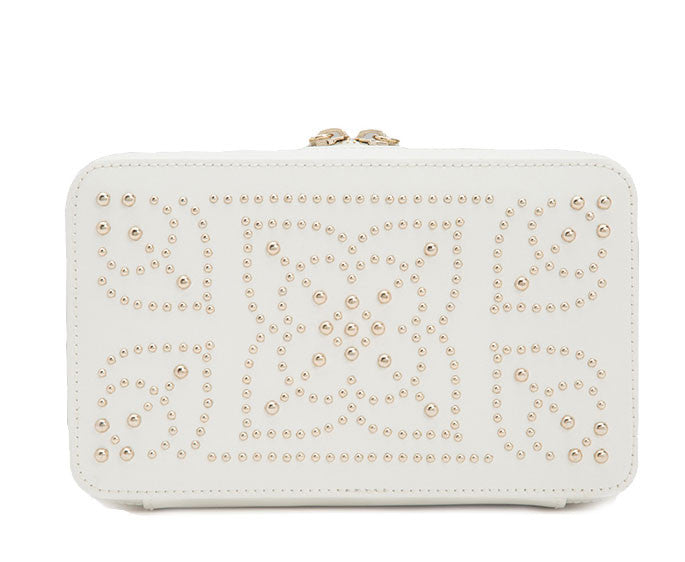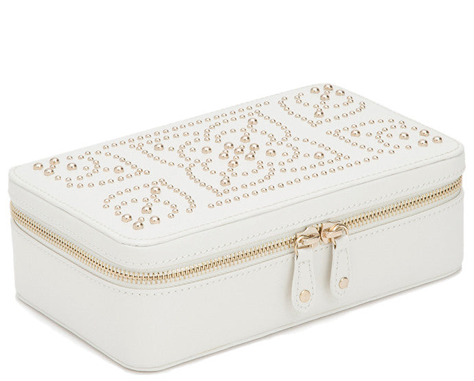 WOLF Marrakesh Zip Jewellery Case Cream . Showcasing an intricate studded mosaic design, the Marrakesh collection features carefully applied gold studs. Includes cream leather, mirror, gold finished hardware, LusterLoc anti tarnish lining, 1 ring rolls and 12 earring holes, 3 necklace holders with pocket and 2 removable compartments.