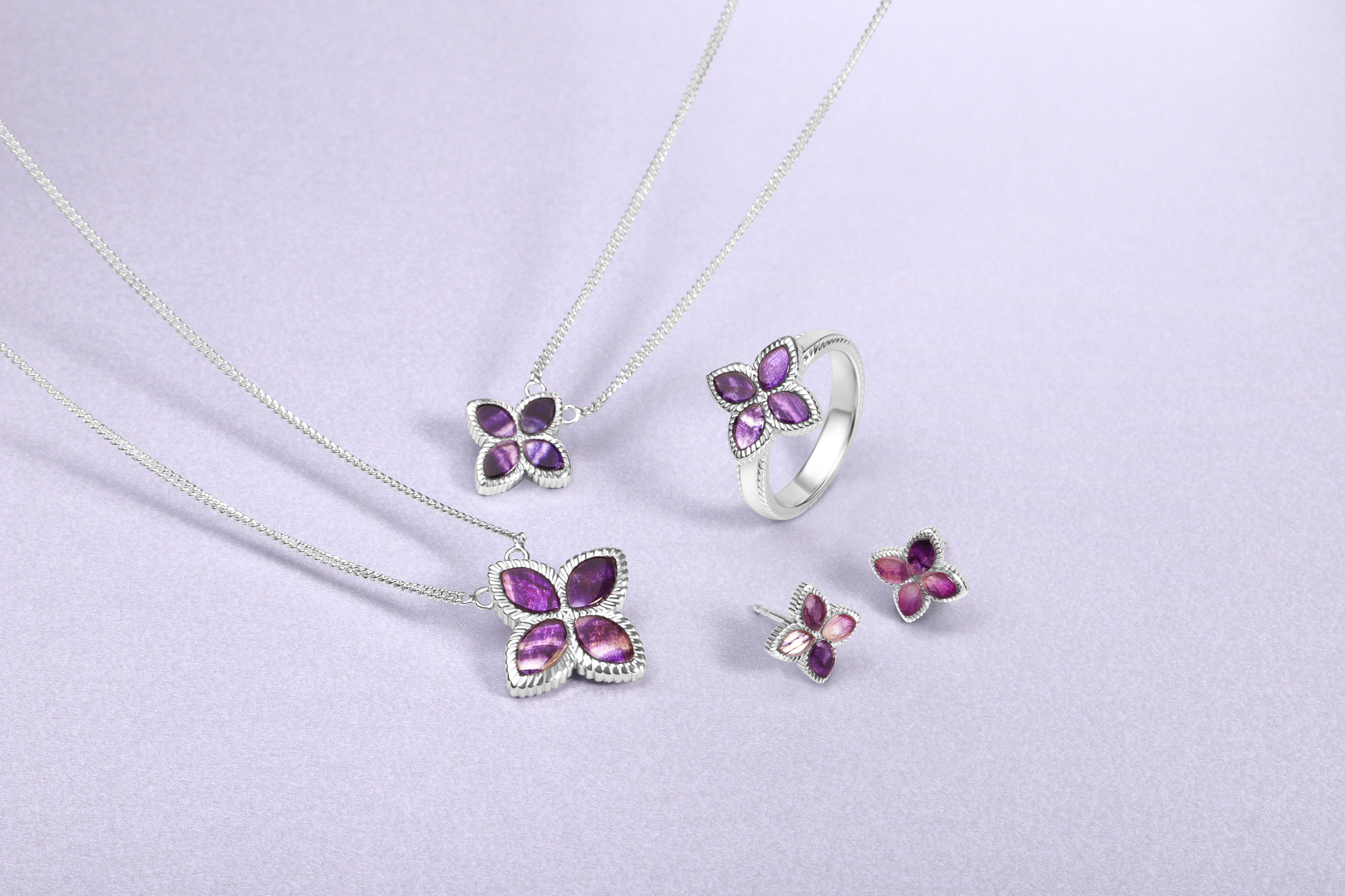 This elegant ring features four stunning marquise shaped cabochons of the finest Blue John stone in the shape of a flower, sourced directly from Derbyshire. The flower is surrounded with a rope edge detail for a unique, stylish finish. The striking Blue John forms a stunning contrast between the sterling silver rope edge frame, creating the perfect look for every occasion.