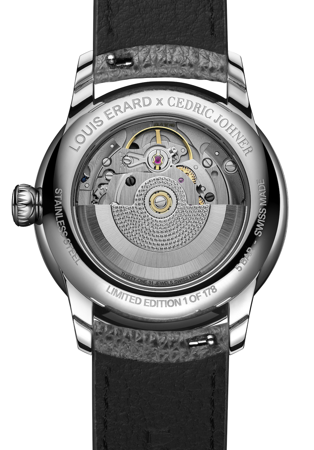 Louis Erard Watch Le Regulateur Louis Erard x Cedric Johner Mauve Limited Edition 85249AA02.BVA153. Louis Erard's new collaboration represents a new stage in the exploration of fine contemporary watchmaking. This time, the collaboration with watchmaker and jeweler Cédric Johner takes craftsmanship to new heights, as he personally hand-decorates the oscillating weight of each movement.