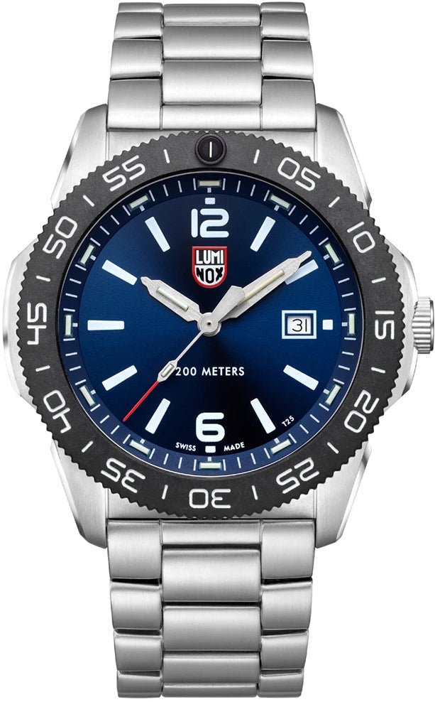 Luminox Watch Pacific Diver Mens XS.3123. The Pacific Diver series features a 44 mm stainless steel case with a CARBONOX uni directional bezel, resulting in an eye catching fusion of materials. Model 3123 comes as a blue dial and black bezel on a stainless steel bracelet. The Pacific Diver series features water resistance to 200 meters, screw in crown and case back, sapphire crystal and, of course, the Luminox Light Technology, which guarantees constant night visibility for up to 25 years. The Luminox motto, Every Second Counts is engraved on the stainless steel case back, to remind you to make the most of every moment you have.