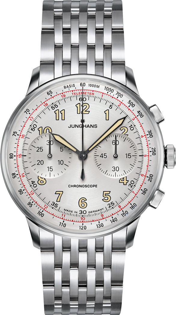 Junghans Watch Telemeter 27/3880.46. The telemeter and tachymeter display were first combined in a single Junghans chronograph in 1951. This legacy is now being perpetuated with the Telemeter, a new retro release of the classic chronograph. An extremely beautiful watch, the Telemeter is as elegant as it is technical and sporty, and just as relevant today as it was upon its original release nearly 70 years ago.