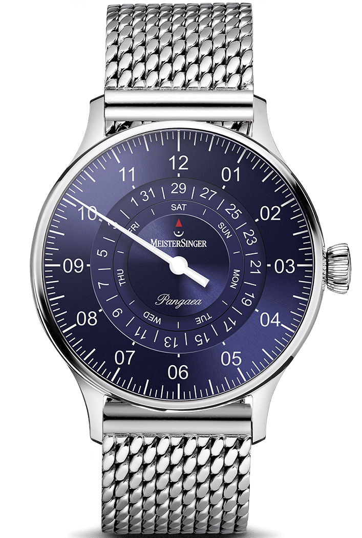 MeisterSinger Watch Pangaea Day Date Milanaise Bracelet PDD908 Milanaise Bracelet. With its day and date ring open under the glass, this watch is the alternative to calendars crowded with dates.
