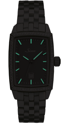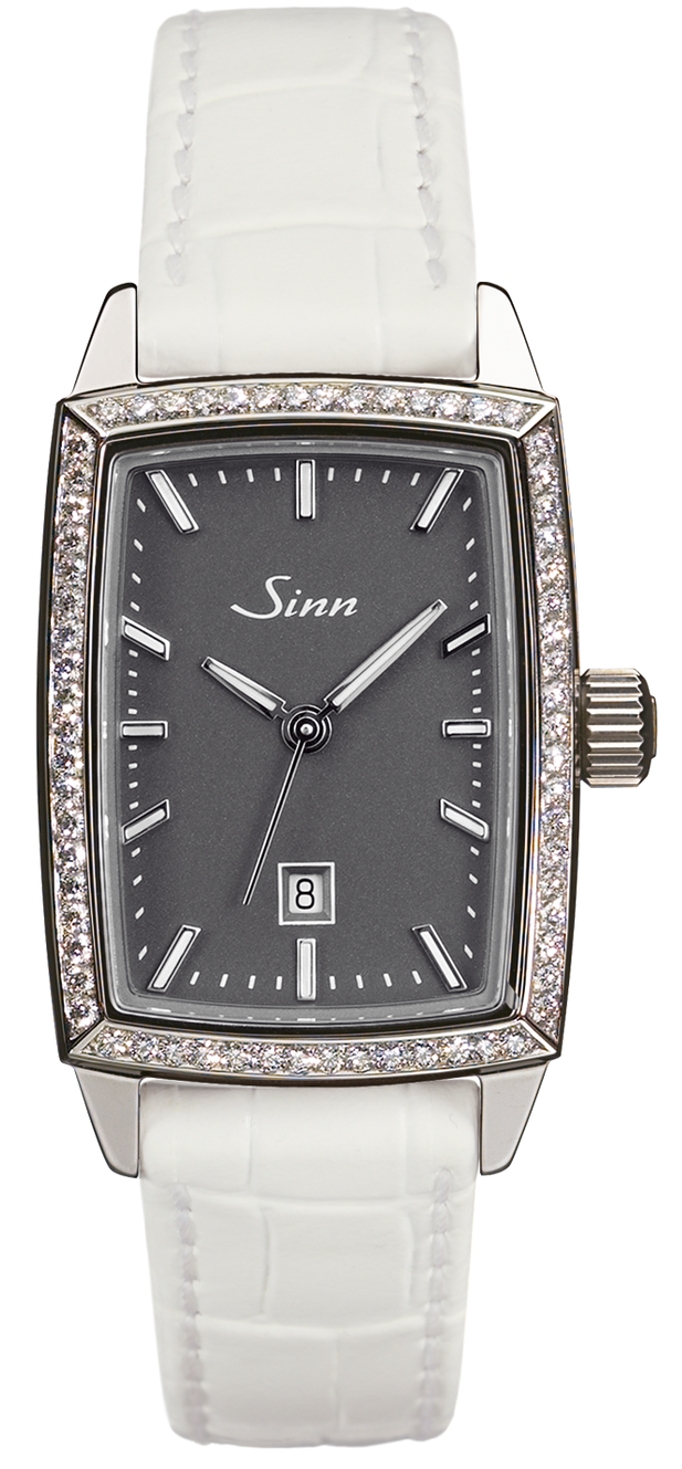 Sinn Watch 243 TW 66 WG A 243.054. Classic design for an elegant, feminine look: these are the timelessly beautiful ladies’ watches of the 243 TW66 series. As an unusual touch of ornamental finesse, the dial of the ladies’ watches is surrounded by a superior decorative ring of 18 ct white gold with 66 precious diamonds in Top Wesselton quality. The rhodium-plated appliqués of the exquisitely decorated dial are set by hand with plenty of attention to detail. And the rectangular case made from high-gloss, warmly gleaming, polished titanium is finished with first-class sapphire crystal glass. Masterful watchmaking and characteristics suitable for everyday use, such as pressure resistance and low-pressure resistance, are all hallmarks of this fine piece of jewellery.