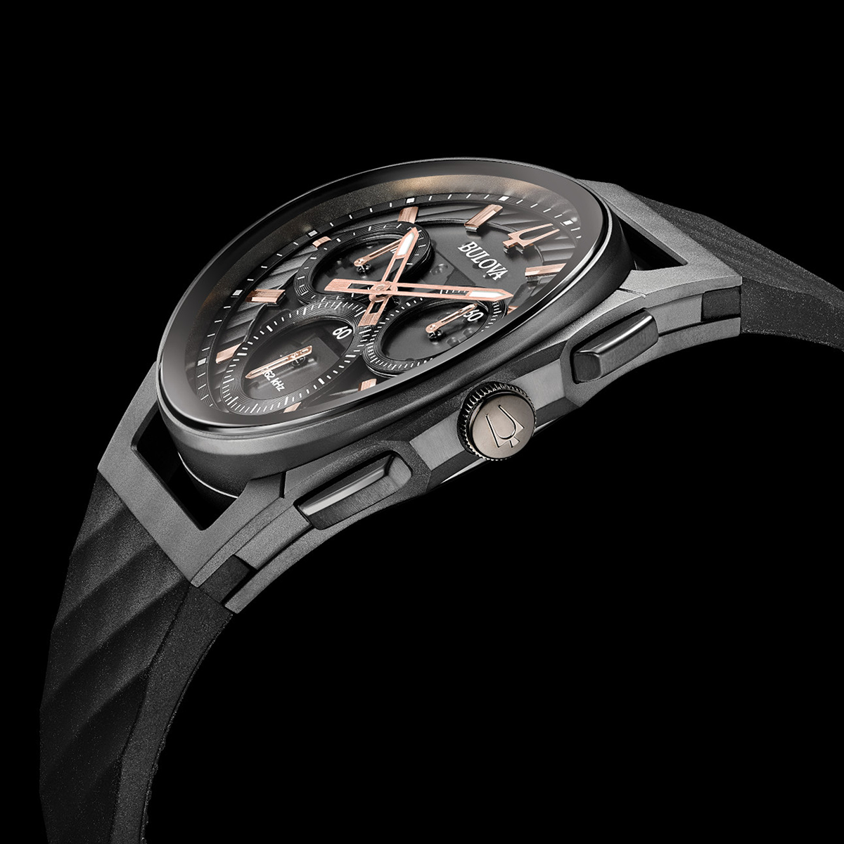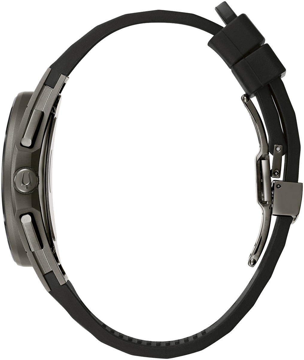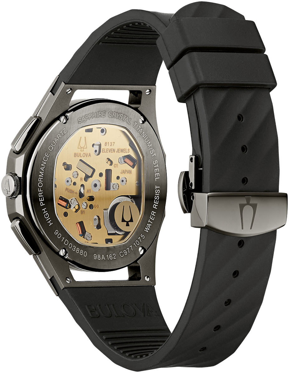 Bulova Watch Curv Chronograph Mens 98A162. The worlds first curved chronograph movement features high performance quartz technology with 262 kHz vibrational frequency for precise accuracy. Five hand chronograph in titanium and stainless steel case, dark grey exhibition dial with rose gold tone accents, exhibition screw back case, curved sapphire glass with black metallization on the outer crystal, black rubber strap with 3 piece buckle closure, and water resistance to 30 meters.