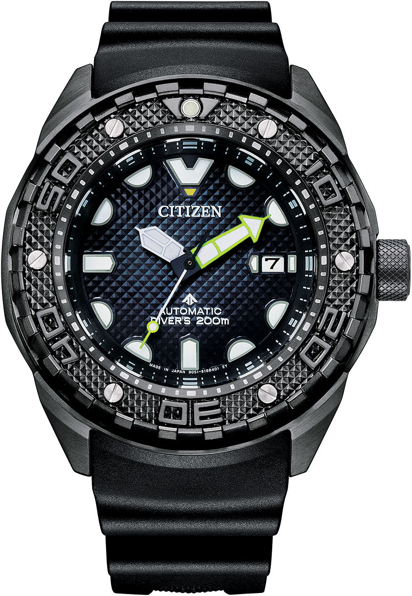 Citizen Watch Promaster Dive Automatic Color. Submerge yourself in a new collection of Automatic Dive watches with a deep connection to Citizen´s history of innovation and proprietary technology. The new Promaster Automatic Diver 200M watch features a Super Titanium‚Ñ¢ case with Duratect DLC coating that is lightweight and durable. The bezel has angled tabs for an easy grip, and both the bezel and dial have pyramid stud design that surrounds an anti-reflective, dual-sphere sapphire crystal, and the dark blue dial complements the titanium case and black polyurethane strap for a strong aesthetic of sport style and performance. Powered by the movement of your wrist, this advanced automatic watch features a 42-hour power reserve and large applied luminous hands and markers to give you an easy read in the dark or underwater. ISO compliant with a screw-down crown and water resistant to 200 metres. the watch also comes with a dive extender strap. Presented in an exclusive collector´s dive tank style box.