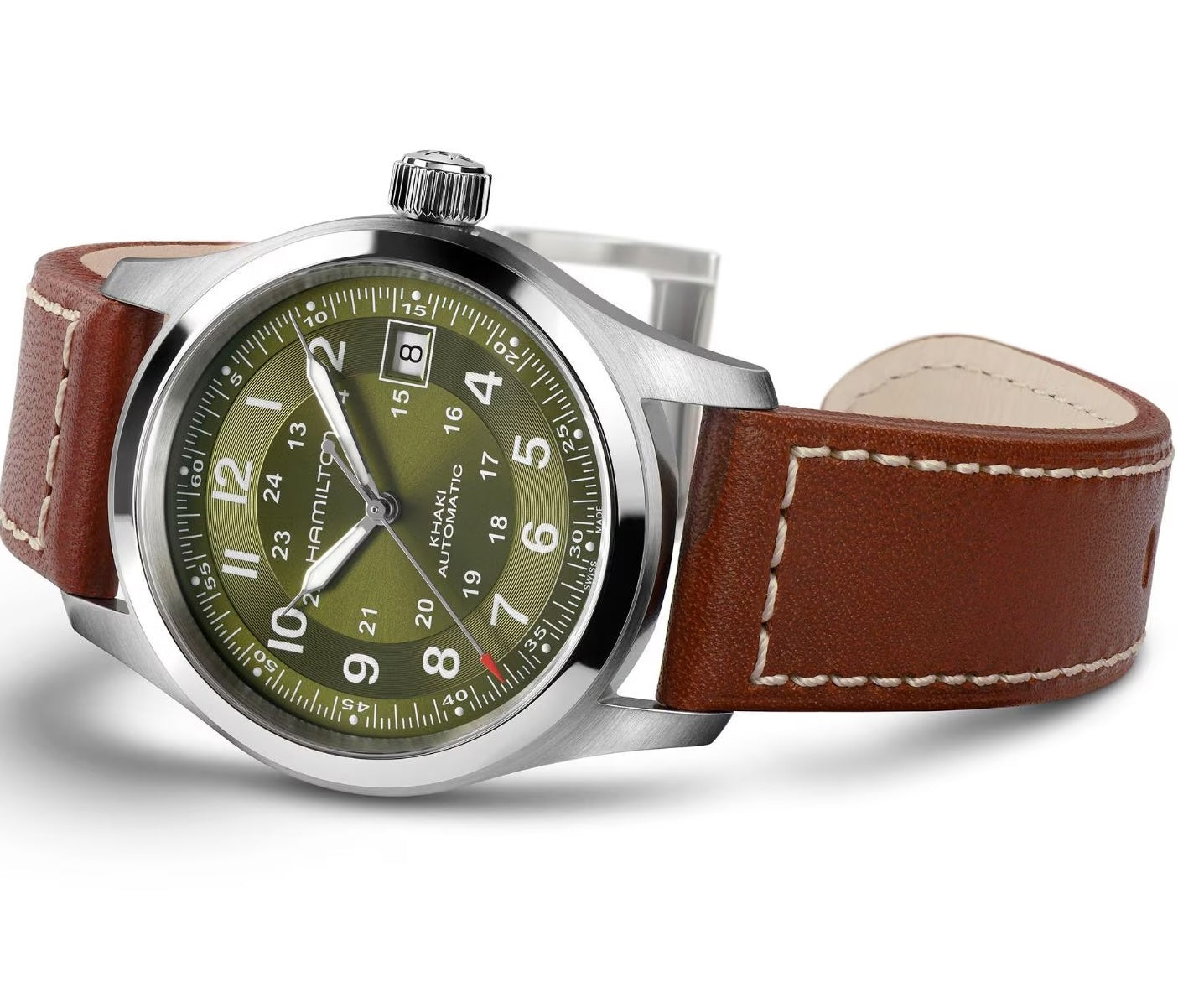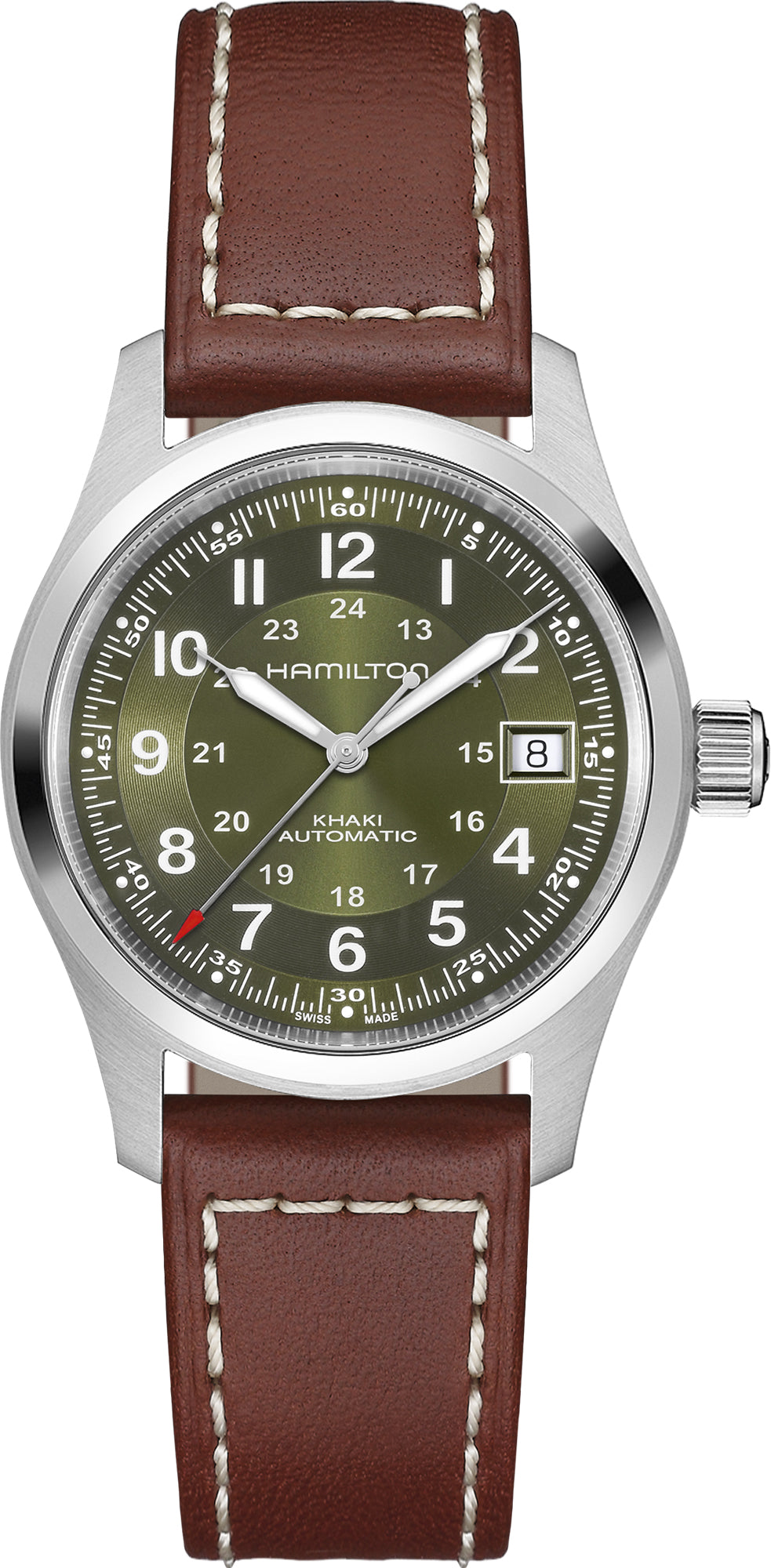 Hamilton Watch Khaki Field Automatic H70455560. Inspired by the original soldiers' watch, the Khaki Field Automatic blends military heritage with contemporary design and offers versatility for modern pioneers. Pairing a khaki green sunray dial with a snailing effect on the hour ring, the dial reflects light whilst boasting texture and depth. Designed for action and built for adventure, the exclusive H-10 automatic caliber offers up to 80 hours of power reserve, ensuring it won't let you down.