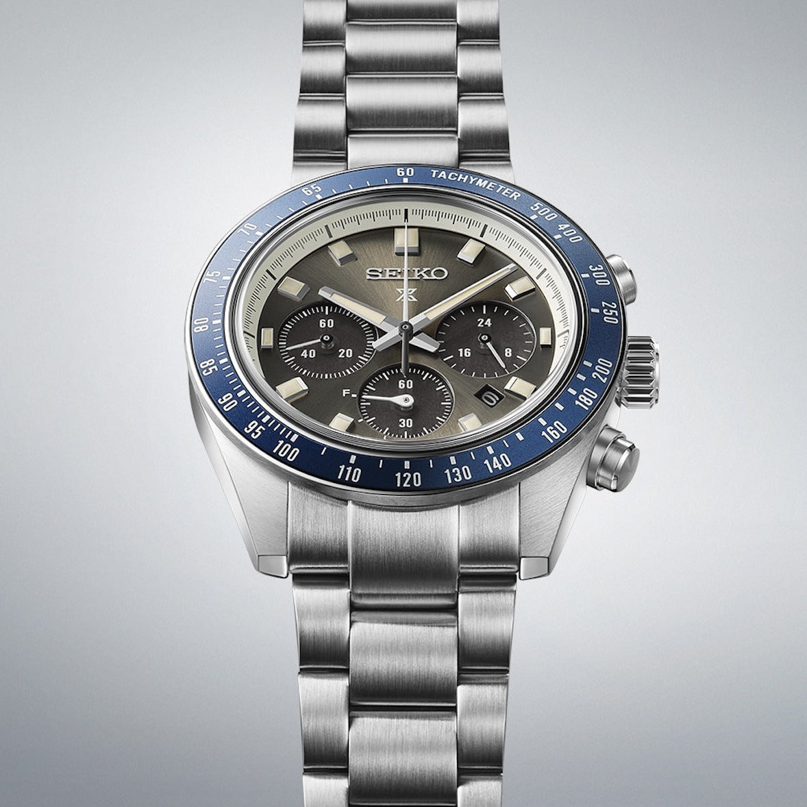 Encased in a navy-blue aluminium bezel and sapphire crystal glass, this chronograph features a clean-cut grey dial, with hour and minute hands that resemble the original Speedtimer from 1969. With 12 spots of Lumibrite, this timepiece is designed to be legible in darker conditions. With a chronograph second scale around the dial ring, this piece also features a Tachymeter on the bezel for measuring speed - an iconic element of the original Seiko Speedtimer.