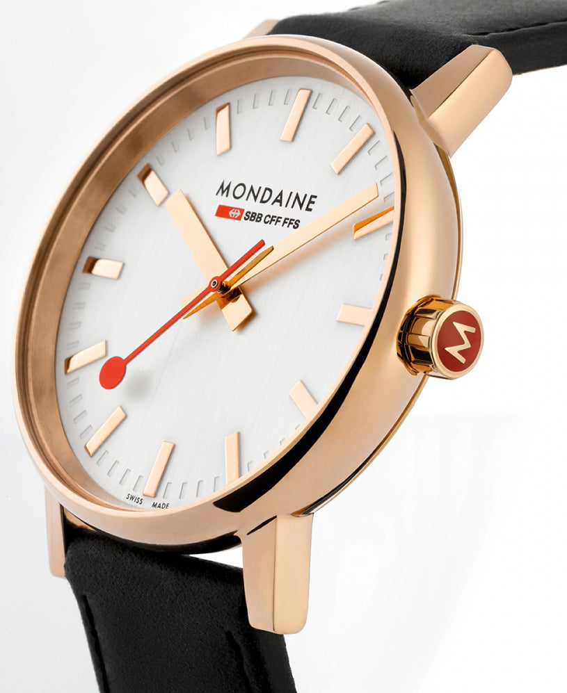 Mondaine Watch Evo2 Rose Gold MSE.40112.LB. or more than 100 years the Swiss Federal Railways have been famous for punctuality and precision. Historically the train station manager used a special red Paddle to announce to passengers and train conductors that the train is about to depart. This red Paddle with its special shape is also the second hand of the Official Swiss Railways Clock. Mondaines original and authentic watch and clock collection captures this pristine and punctual look.