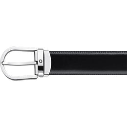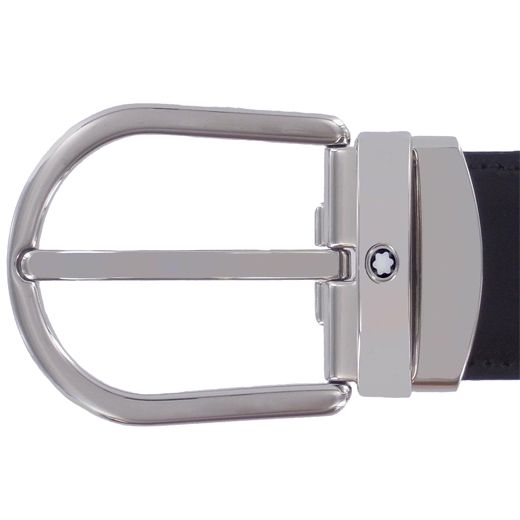 Shiny palladium finish horseshoe pin buckle with engraved Montblanc brand name on the sides and Montblanc emblem. Self-adjustable, 3 cm x 120 cm, reversible black/brown leather strap. Refined and understated, for any kind of look.