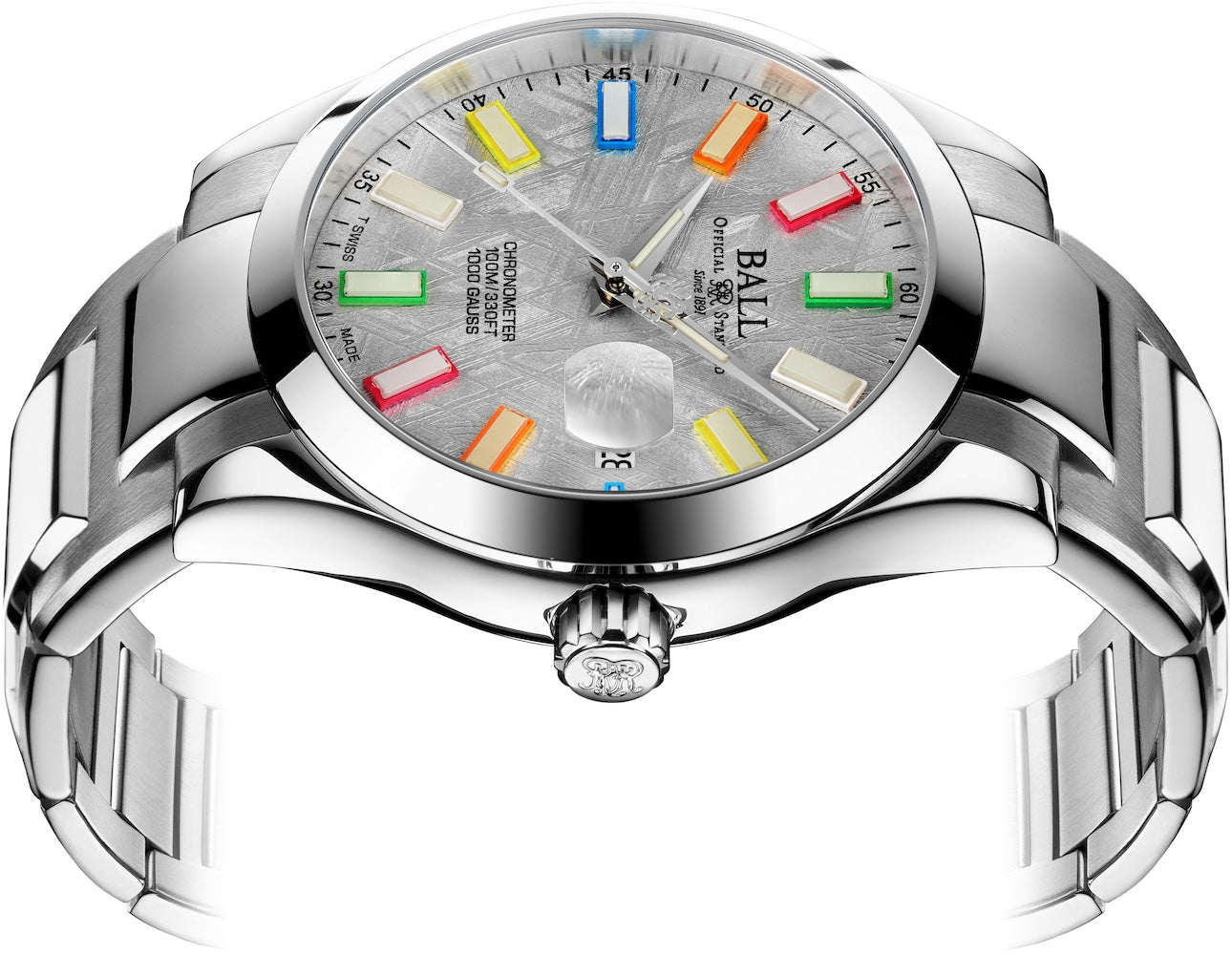 This men’s 40mm Ball Engineer III Marvelight Chronometer Meteorite watch reference NM9026C-S46C-MSL is powered by a COSC movement , which sits inside a case resistant to magnetic forces reaching 5,000Gs. The watch also comes fitted on a matching stainless steel bracelet with a folding clasp stamped with the Ball logo.