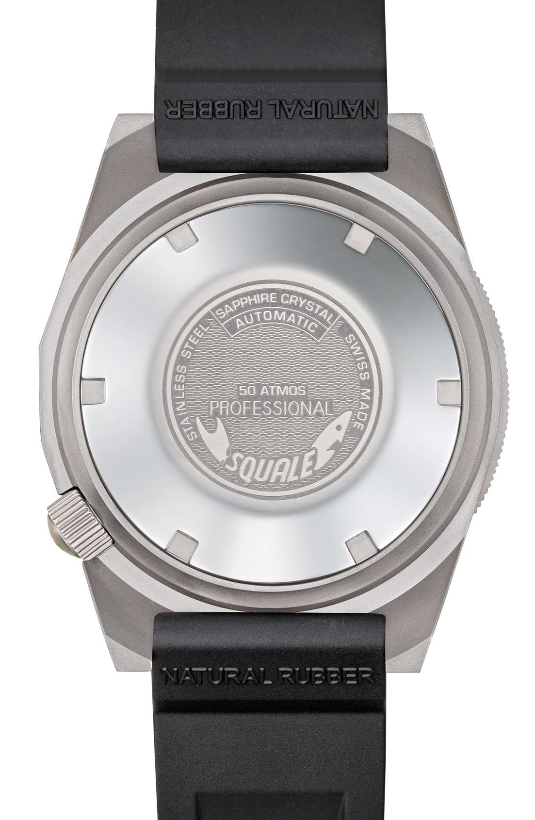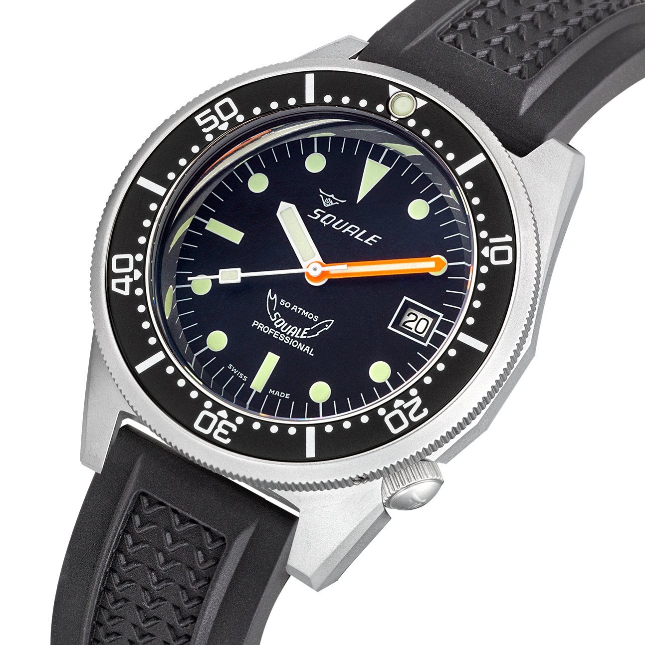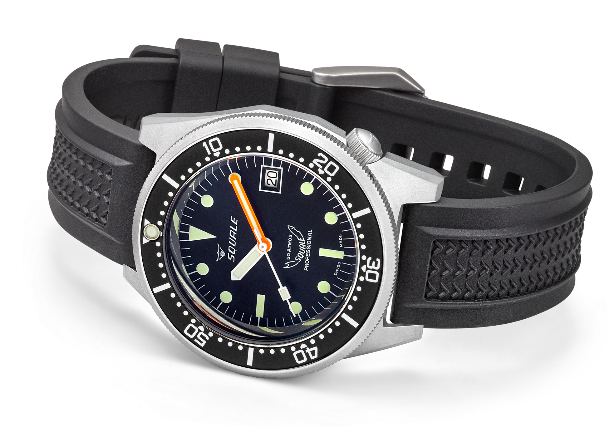 Squale Watch 1521 Black Blasted Rubber 1521BKBL.VO. Since the 1950s, the name Squale and the classic Shark logo, Squale translates to Shark, have come to mean one thing, professional dive watches. Squale introduced their first 1000m dive watch with a unique crystal on flexible mountings that did not use or need a Helium release valve. Squale started to supply the elite corps of a large number of armed forces.