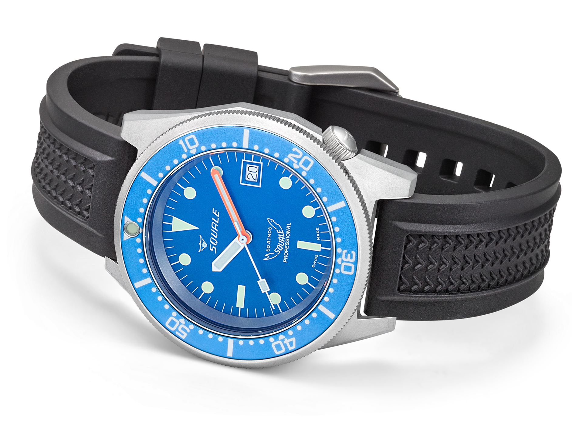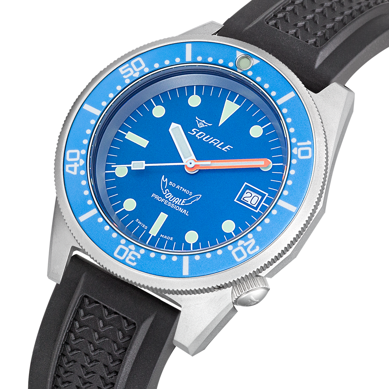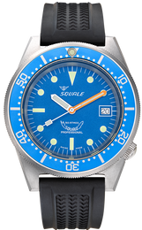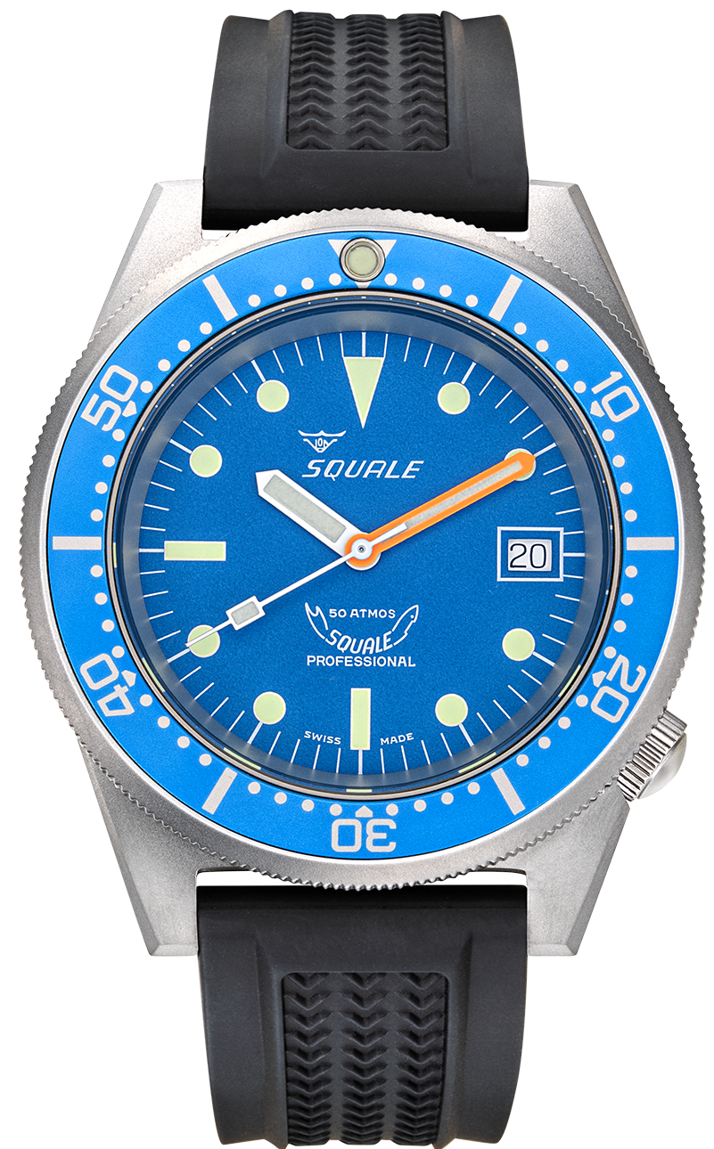 Squale Watch 1521 Blue Blasted Rubber 1521BLUEBL.VO. Since the 1950s, the name Squale and the classic Shark logo, Squale translates to Shark, have come to mean one thing, professional dive watches. Squale introduced their first 1000m dive watch with a unique crystal on flexible mountings that did not use or need a Helium release valve. Squale started to supply the elite corps of a large number of armed forces.