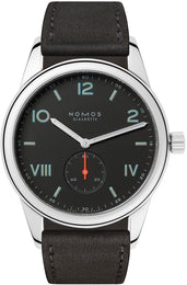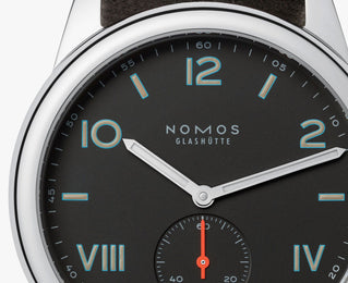 Nomos Glashutte Watch Club 38 Campus Nacht Steel Back 736. Club 38 Campus Nacht is more of a night owl than an early bird. Yet it always feels well rested and ready to go. This is because the NOMOS caliber Alpha is at work within telling time, reliable and robust. Even when you are feeling out of your depth, this timepiece is water resistant to 100 meters. During the day, the gray numerals and hands stand out on the deep black dial; in the dark they shine blue wherever the night takes you.