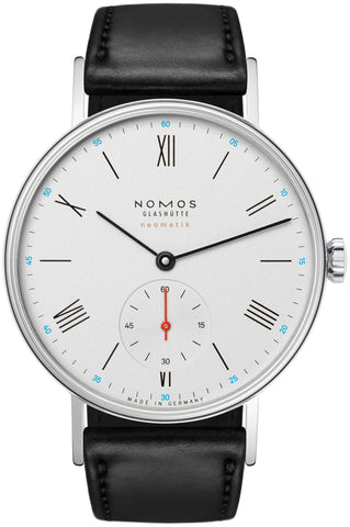 Nomos Glashutte Watch Ludwig Neomatik Sapphire Crystal 282. Tradition reinterpreted for today, Ludwig neomatik, self winding and with subtle accents in cyan blue. These details beautifully compliment the warm silver plated dial and the slender elegance of the watchs case. Ludwig neomatik has what counts on the inside as well: As with all watches in the neomatik series, within this timepiece ticks the next generation automatic caliber DUW 3001.